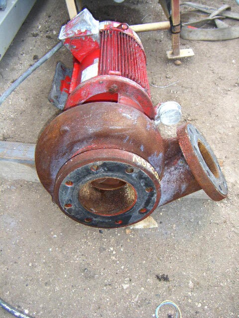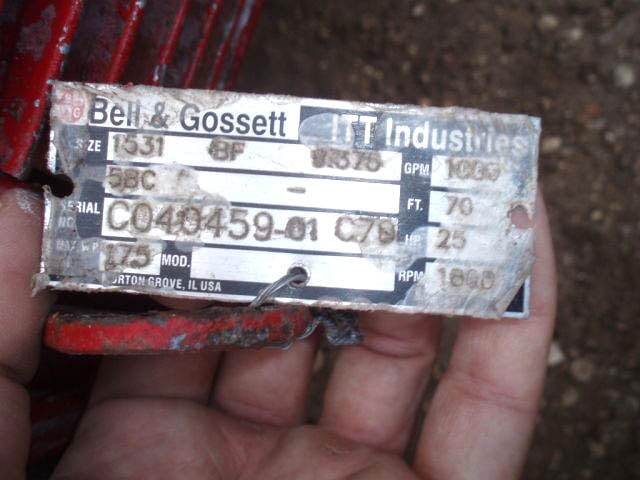Bomba centrífuga Bell & Gossett ITT Industries. Número de modelo: C040459-01 C70. Capacidad: 1000 gpm. Tamaño: 1531 BF. Presión máxima de trabajo: 175. Motor eléctrico Emerson: 25 hp, 1770 rpm, 68-61/31 amperios, 208-230/460 V, 60 Hz, trifásico. Entrada: puerto de succión de 6 pulgadas. Salida: Puerto de descarga de 5 pulg. Dimensiones totales: 3 pies 2 pulgadas de largo x 2 pies de ancho x 1 pie 8 pulgadas de alto (H9/5F).