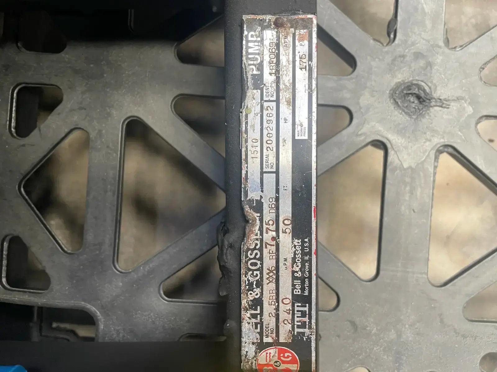 Bomba centrífuga Bell & Gossett serie 1510. Modelo: 2.5BB BF7.75 D69. Número de serie: 2002962. Número de identificación: 1BF069. Máx. GPM: 240. Máx. a presión de trabajo: 175 PSI. Temperatura mínima: -20. Temperatura máxima: 250 F.