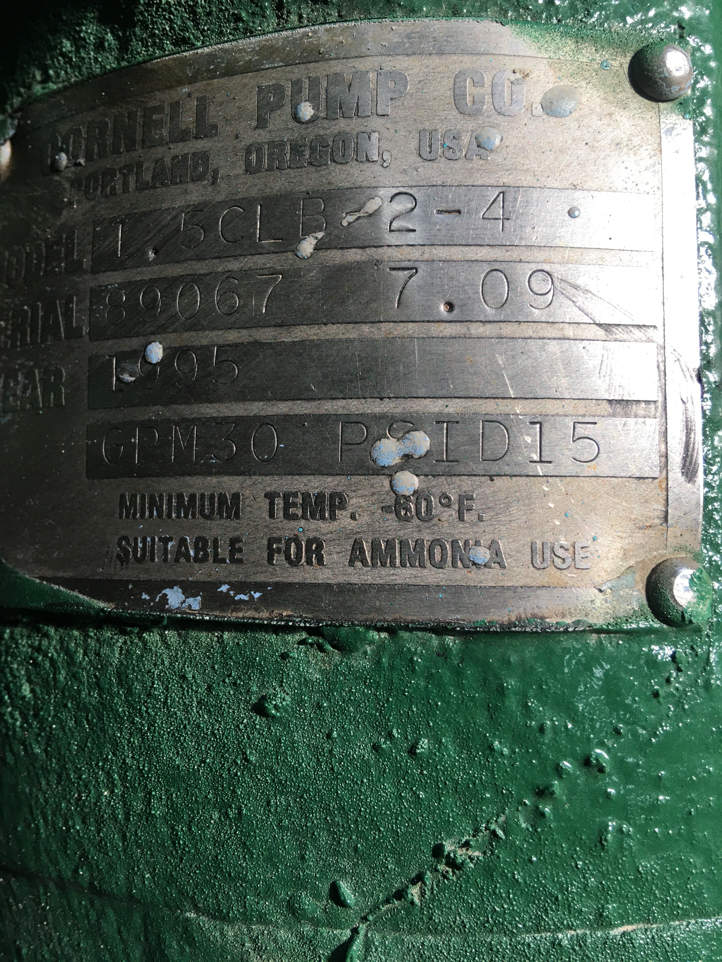 Bomba de refrigerante Cornell 1.5 CLB - Modelo: 1.5CLB-2-4, Número de serie: 89067 7.09. Año de fabricación 1995. Especificaciones proporcionadas por Cornell Mfg: Flujo mínimo: 15 GPM, Flujo máximo: 140 GPM, Conexión de descarga (pulg): 1,5, Conexión de succión (pulg): 4, Manejo de sólidos (pulg): 0,43, RPM máximas: 1800. La bomba ha sido repintada. Motor eléctrico trifásico de marca desconocida: Cat No: A15085D-55, Especificaciones: 05E96W54G1, Marco: 145TCZ, Ser: F295, Hp: 1 1/2, Amps: 5/2.5, Rpm: 1450, Hz: 50, Ser F: 1.15, Ph: 3, Des: B, Clase: F, Código K, Nema Nom.Eff: 85.5%, PF: 82%, Clasificación: 40C AMB-CONT Refer Duty.