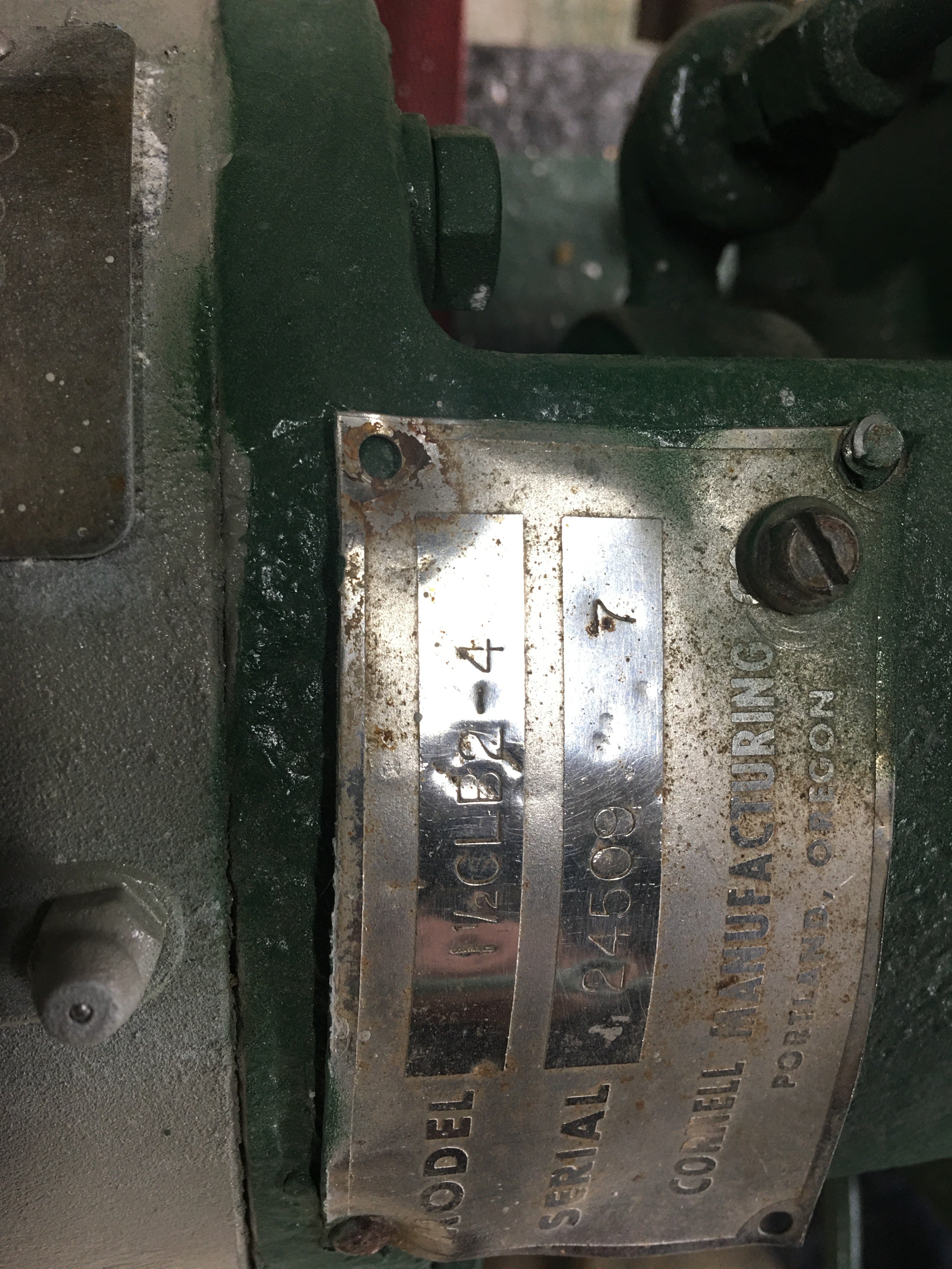 Bomba centrífuga Cornell - Modelo: 1 1/2 CLB2-4, Número de serie: 24500 7 Motor eléctrico Baldor: Número de gato: JPM3558T, Especificaciones: 35E972-872, Hp: 2, Voltios: 208/-230/460, Amperios: 6.5 - 6,2/3,1, rpm; 1725, Marco: 145JP, Hz 60, Ph: 3, Clasificación: 40C AMB- Cont.