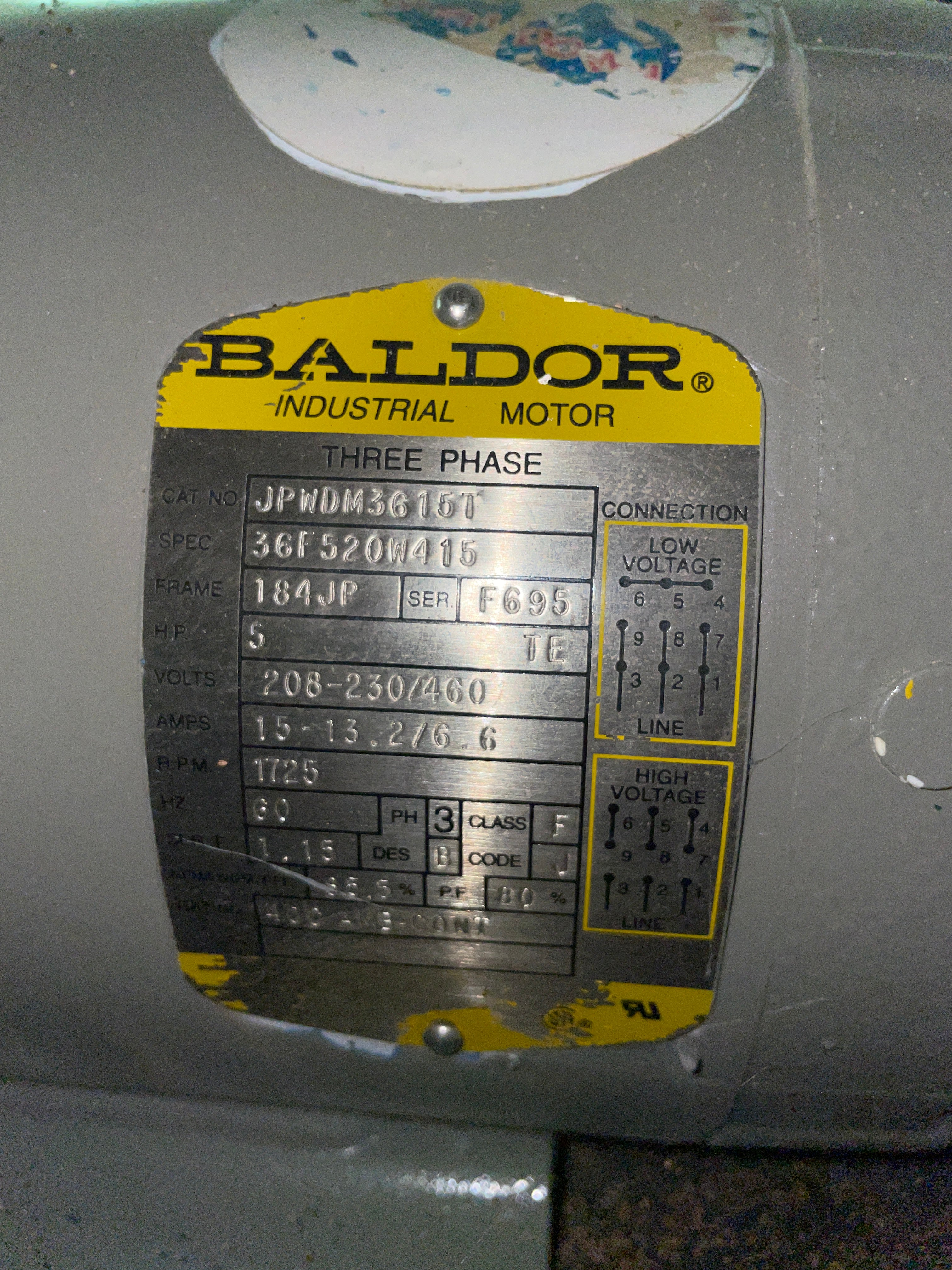 Bomba de refrigerante Cornell serie 2CB - Modelo: 2CB5-4, número de serie: 32006 10. Flujo mínimo de GPM: 40, flujo máximo de GPM: 200. Tamaño de descarga (pulg.): 2, Tamaño de succión (pulg): 4. Manejo de sólidos (pulg. ): .37. RPM máximas: 1800. Presión máxima de trabajo: 250 psi. La bomba ha sido repintada. Motor Baldor - Número de catálogo: JPWDM3615T, Especificaciones: 36F520W415, Marco: 184JP, HP: 5, Serie: F695, Voltios: 208-230/460, Amperios: 15-13.2/6.6, RPM: 1725, Hz: 60.