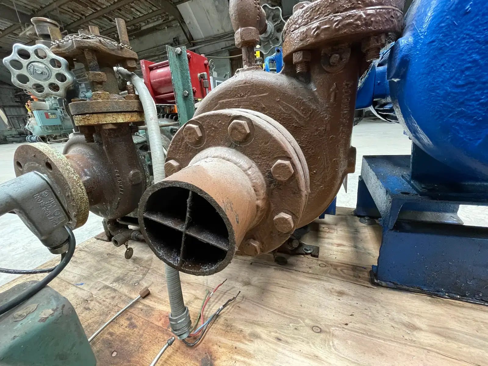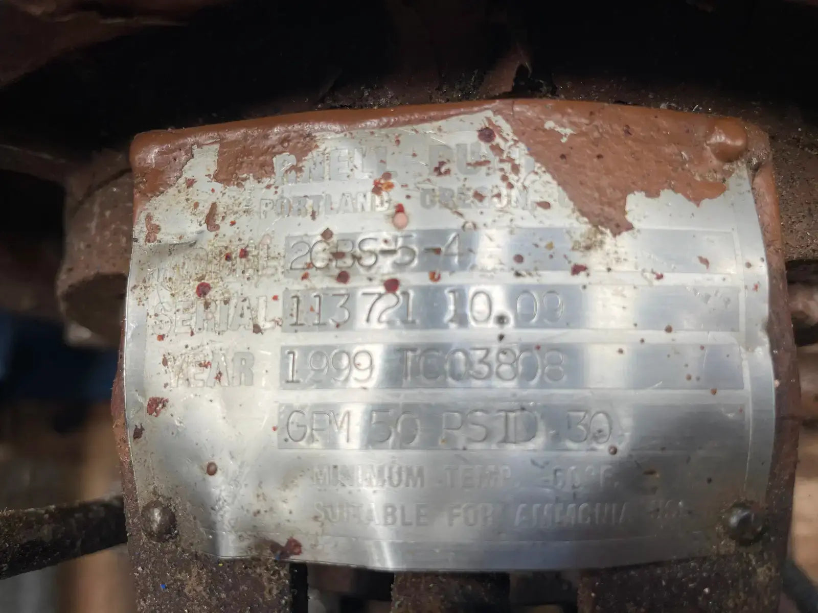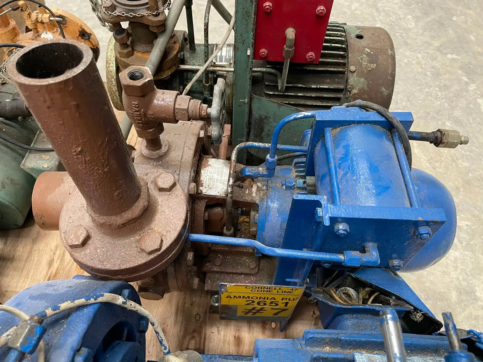 Bomba centrífuga de amoníaco Cornell. Modelo: 2CBS-5-4, Serie: 113721 10.09. Descarga (pulg.): 2. Succión (pulg.): 4. Flujo mínimo: 50 GPM, flujo máximo: 200 GPM, velocidad máxima (RPM): 1800. Material estándar de hierro fundido. Utilizado anteriormente con amoníaco R-717