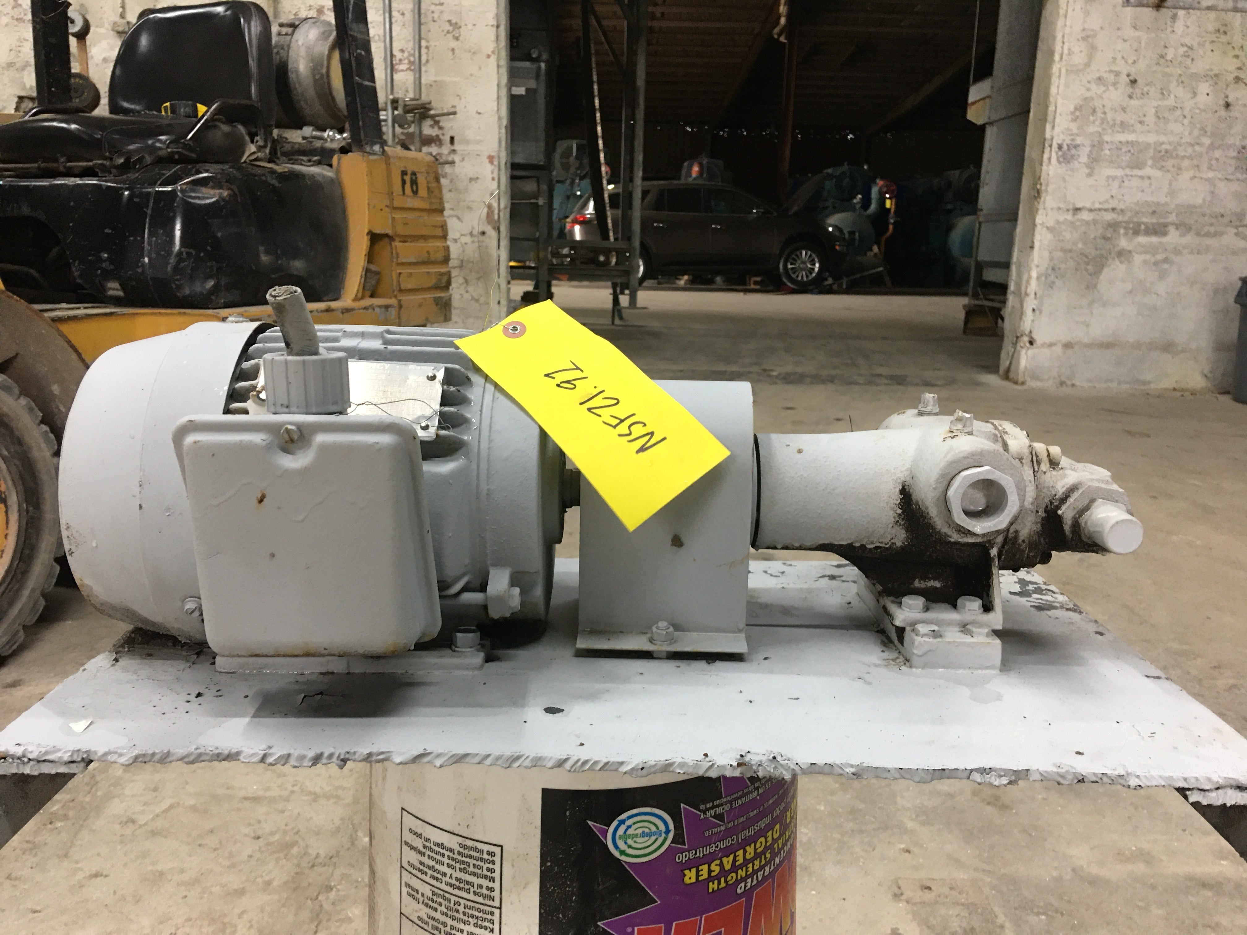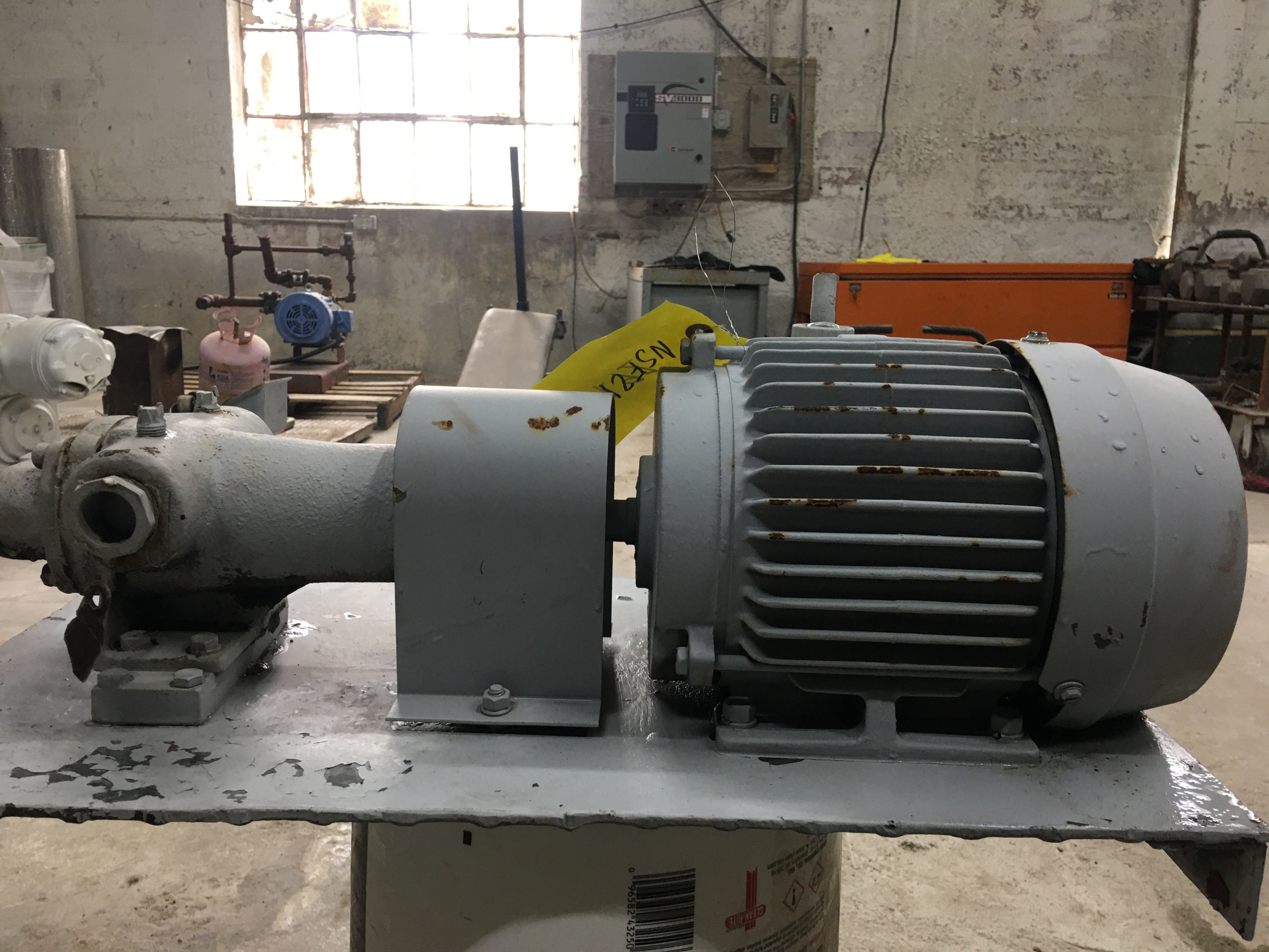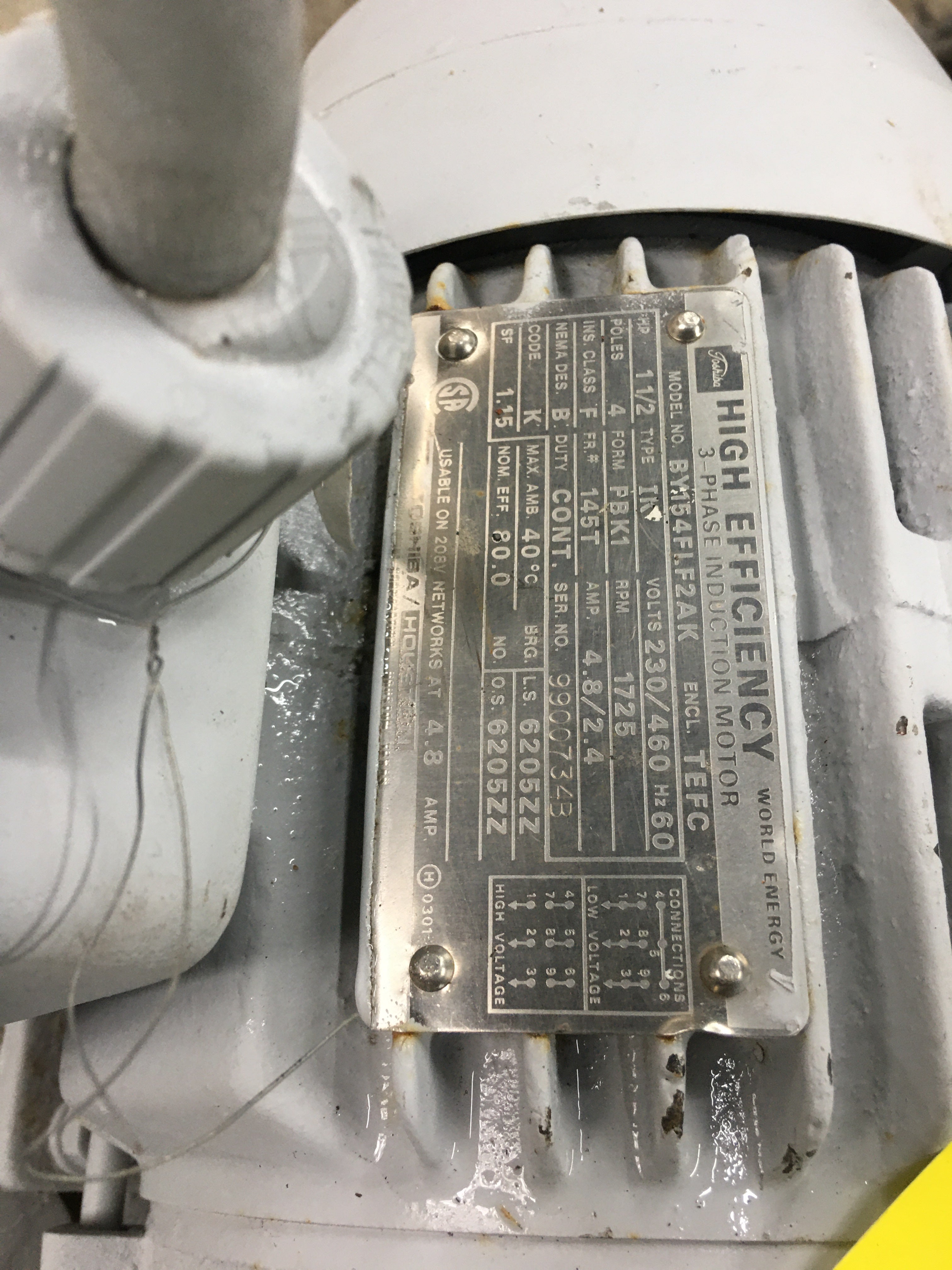 Bomba de engranajes rotativos: le falta la placa de identificación. Puerto de succión (pulg): 2, Puerto de descarga (pulg): 2. Motor Toshiba de alta eficiencia: HP: 1 1/2, Tipo: IN, Voltios: 230/460, Hz; 60, Forma: PBK1, Rpm: 1725, Fr: 145T. Motor Toshiba de alta eficiencia: N.º de modelo: BY154F1FAK, ENCL: TEFC, Hp: 1 1/2, Tipo: IN, Voltios: 230/460, Hz; 60, Forma: PBK1, Rpm: 1725, Fr: 145T, Servicio: CONT, Número de serie: 99007343, Amb máx.: 40c, Ef nom: 80c, utilizable en redes de 208 V a 4,8 amperios. Polos: 4, Clase Ins: F, Nema Des: B, Código: K, Sp: 1.15.