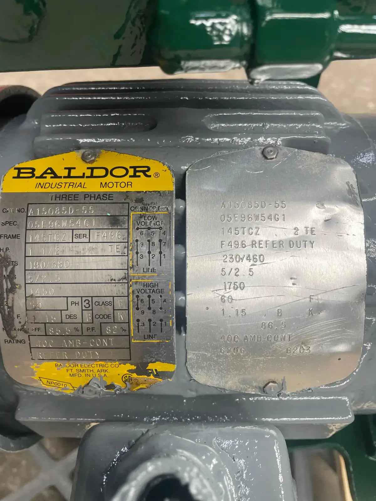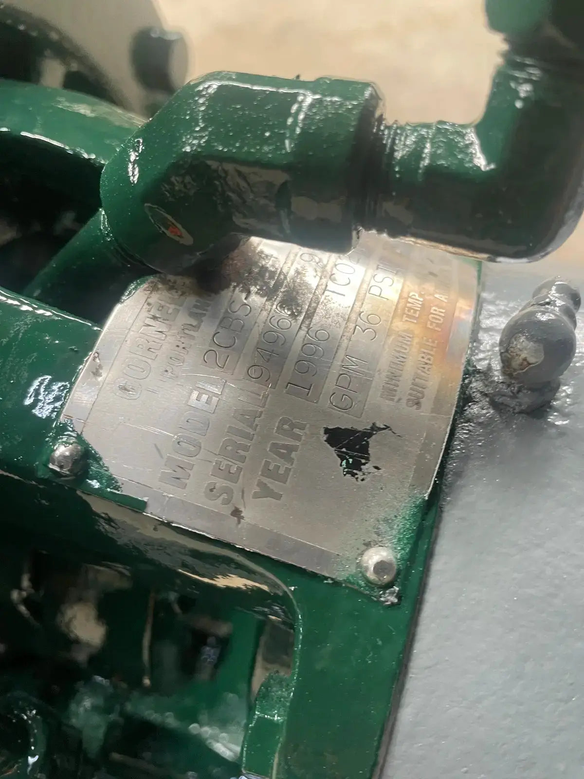 Bomba de refrigerante Cornell 2CBS - Modelo: 2CBS-2-4, número de serie: 94966-9.19. Niveles operativos del modelo Cornell 2CBS obtenidos de las especificaciones de Cornell MFG: flujo mínimo: 40 GPM, flujo máximo 200 GPM, conexión de descarga (pulg): 2, conexión de succión (pulg): 4, RPM máximas: 1750.