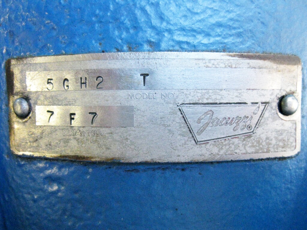 Bomba centrífuga para jacuzzi. Modelo: 5GH2 T. S/N: 7F7. Motor industrial Baldor: 5 hp, 3450 rpm, 230/460 V, 11,5/5,7 A, 60 Hz, trifásico. 5 pulgadas de diámetro. impulso. Entrada/salida: (1) 3 pulg. de diámetro. brida con (4) orificios de montaje de ¾ pulg. 4-1/4 pulgadas adyacentes, 6 pulgadas opuestas. (1) 2 pulgadas de diámetro. brida con (4) orificios de montaje de ¾ pulg. 3-3/8 pulgadas adyacentes, 4-3/4 pulgadas opuestas. Dimensiones totales: 1 pie 11-1/2 pulg. de largo x 1 pie 2 pulg. de ancho x 1 pie ½ pulg. de alto.