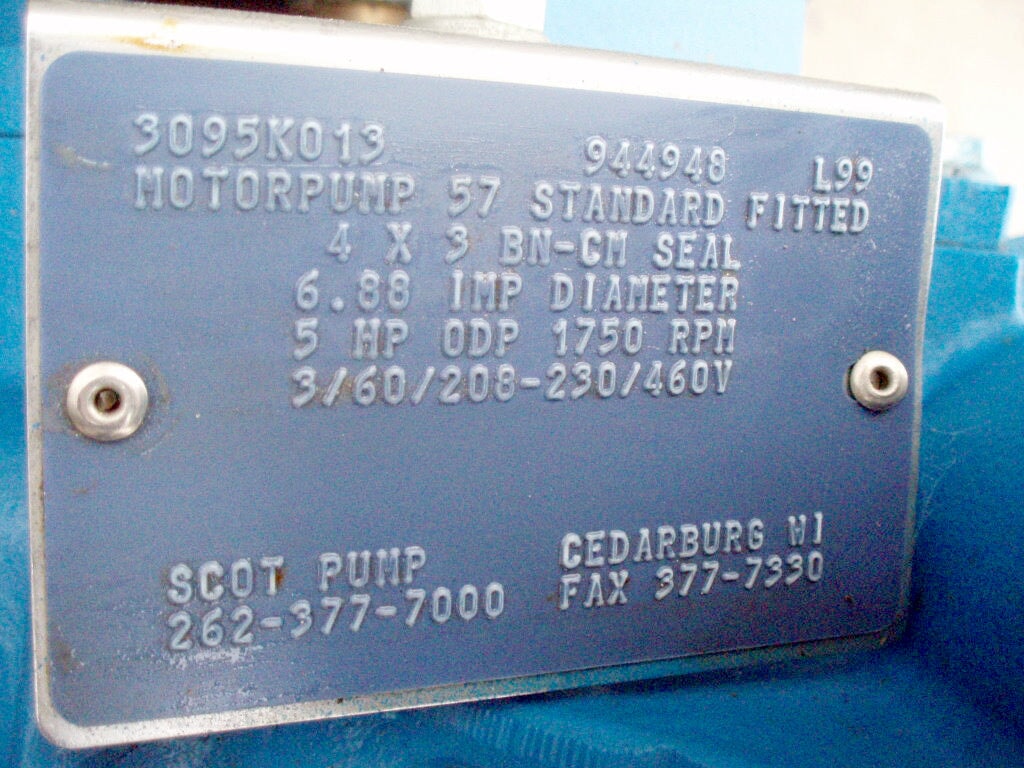 Las bombas de circulación Scot Motorpump 57 están equipadas con trampas Keckley 4. Tamaño del impulsor: 6,88 pulg. de diámetro. Motor eléctrico Baldor, 5 hp, 1725 rpm, 208-230/460 V, 14,8-14,0/7,0 amperios, 60 Hz, trifásico. Entrada: (1) 4 pulg. de diámetro. Puerto de succión con un diámetro de 9 pulgadas. brida y (8) 3/4 pulg. de diámetro. a través de orificios a una distancia entre centros de 2-7/8 pulg. Salida: (1) 3 pulg. de diámetro. Puerto de descarga con un diámetro de 7-5/8 pulg. brida y (4) 3/4 pulg. de diámetro. a través de orificios a una distancia entre centros de 4-3/8 pulg. Dimensiones totales: 2 pies 11 pulg. de largo x 1 pie 1-1/2 pulg. de ancho x 1 pie 4 pulg. de alto.