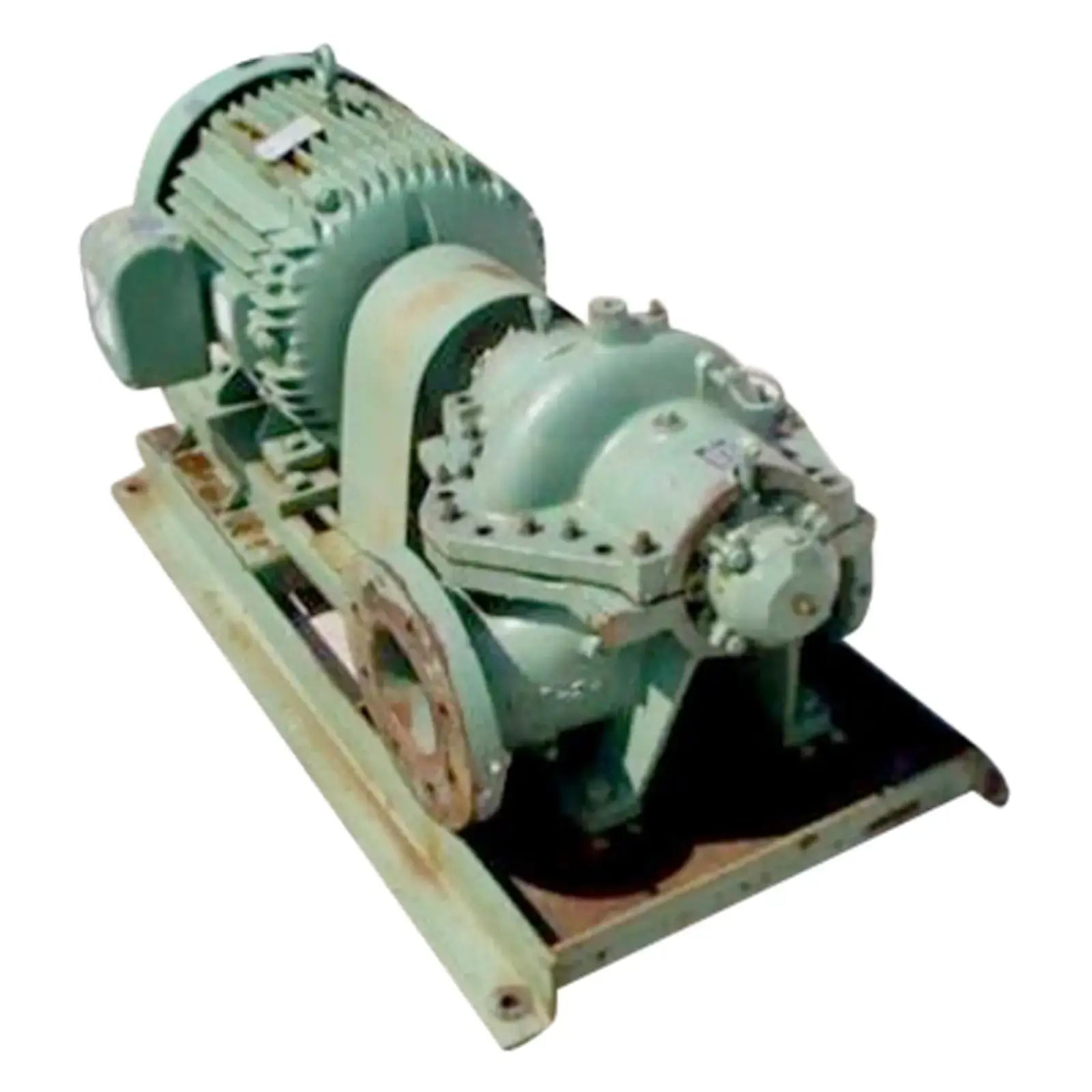 Bomba centrífuga de caja dividida Taco 2000. Modelo: TA1024B201B2SO. Capacidad actual: 900 gpm @ 200 tdh. Capacidad nominal: 1350 gpm. Diámetro del impulsor: Motor eléctrico Baldor de 8,0 pulg., 75 hp, 3550 rpm, 230/460 V, 166/83 amperios, 60 Hz, trifásico. Entrada: (1) 6 pulg. de diámetro. puerto embridado. Salida: (1) 4 pulg. de diámetro. puerto embridado. El diseño de carcasa resistente y resistente permite presiones de trabajo más altas, fácil acceso para servicio y mantenimiento y bajos requisitos de NPSH con mayor eficiencia. Otras características incluyen: disposición compacta que aumenta la vida útil del sello y del rodamiento, cargas axiales equilibradas para una vida útil máxima del rodamiento y anillos de desgaste independientes de la caja. Peso de envío: 1578 libras. Dimensiones totales: 5 pies de largo x 2 pies 5 pulgadas de ancho x 2 pies 8 pulgadas de alto (ACN87)(H9/5F).
