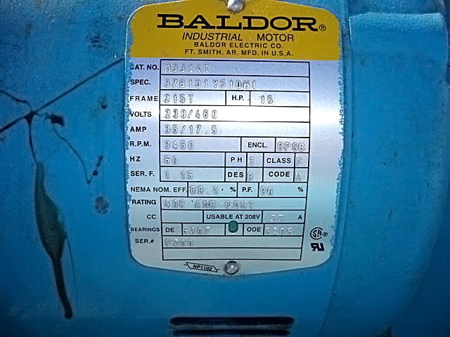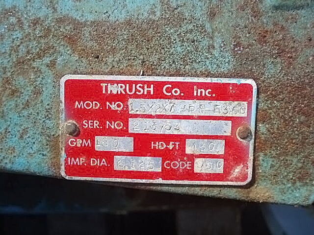 Bomba Centrífuga de Circulación Thrush - 15 HP. Modelo: 1,5x2x7 CV F-E300. S/N: 213753. Capacidad: 160 gpm. Diámetro del impulsor: 6,125 pulg. Motor: Motor industrial Baldor de 15 hp, 3450 rpm, 230/460 V, 35/17,5 amperios, 60 Hz, trifásico. Entrada: 2 pulgadas de diámetro. succión. Salida: Descarga de 1-1/2 pulg. Dimensión total: 3 pies 10 pulgadas de largo x 1 pie 5 pulgadas de ancho x 1 pie 9 pulgadas de alto (H9).