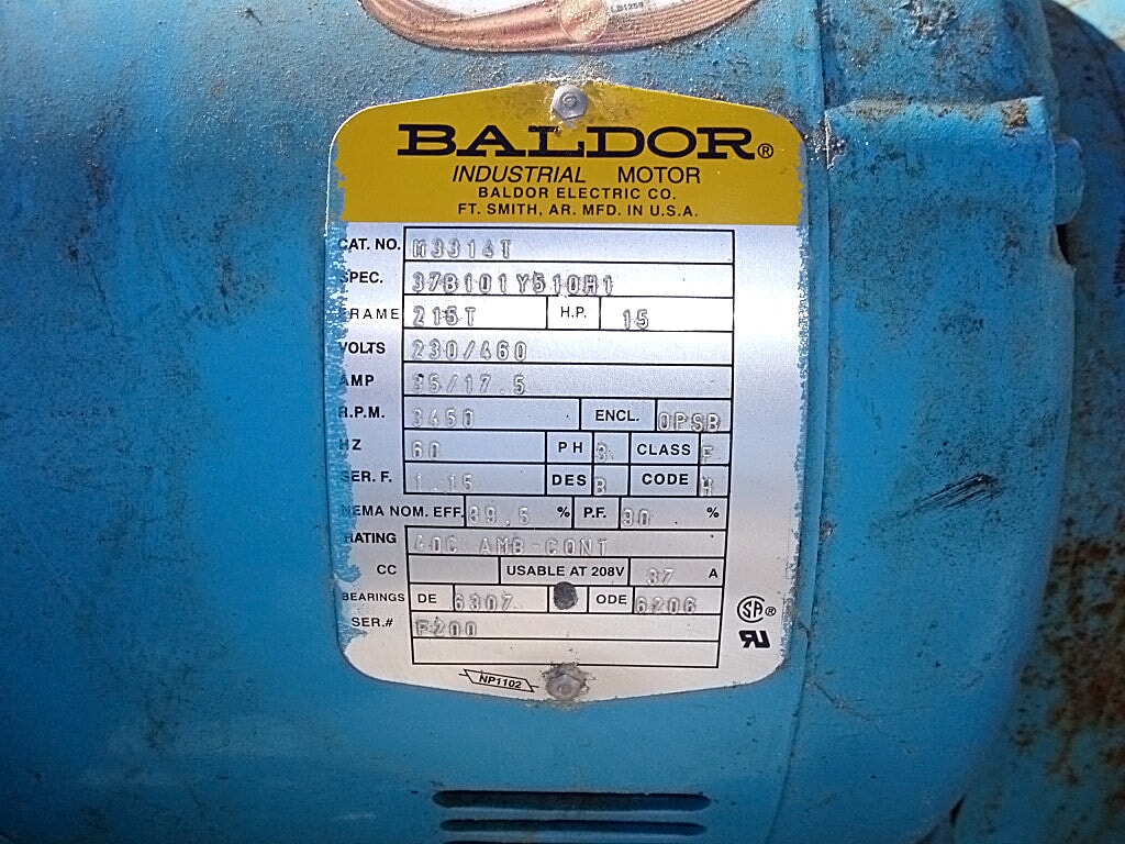 Bomba Centrífuga de Circulación Thrush - 15 HP. Modelo: 1,5x2x7 CV F-E300. Capacidad: 160 gpm. Diámetro del impulsor: 6,125 pulg. Motor: motor industrial Baldor de 15 hp, 3450 rpm, 230/460 V, 35/17,5 amperios, 60 Hz, trifásico. Entrada: succión de 2 pulgadas. Salida: Descarga de 1-1/2 pulg. Dimensión total: 3 pies 10 pulgadas de largo x 1 pie 5 pulgadas de ancho x 1 pie 9 pulgadas de alto (H9).