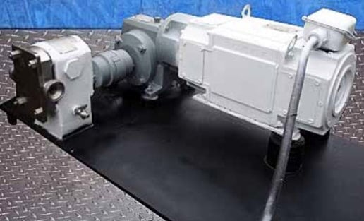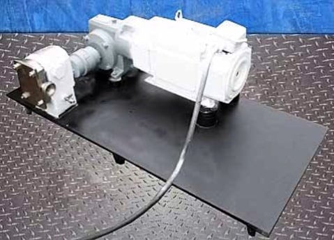Bomba de desplazamiento positivo APV Crepaco Serie R. Modelo: R1R. S/N: 20086. Capacidad: 3,5 gpm. Desplazamiento por revolución: 0,01 gal. Velocidad máxima: 600 rpm. Motor eléctrico Reliance, 1,5 hp, 1750 rpm, 180 V (inducido) -100/200 V (campo), 7,4 amperios (inducido) -0,96/0,48 amperios (campo). Accionamiento por motor en ángulo recto, relación 5, 350 rpm (final). Entradas/salidas: (2) 1-1/2 pulg. de diámetro. Accesorios ACME. Dimensiones totales: 3 pies 8 pulgadas de largo x 2 pies 10 pulgadas. Ancho x 1 pie 5 pulgadas alto.