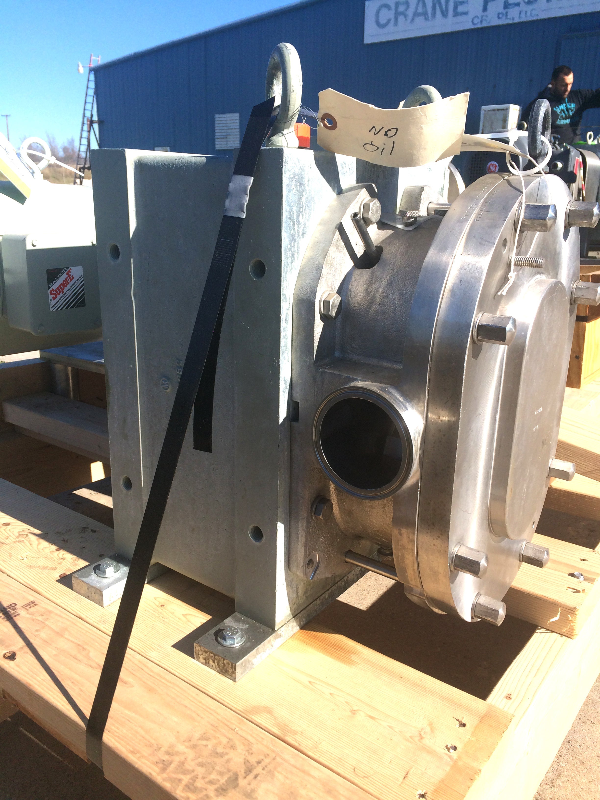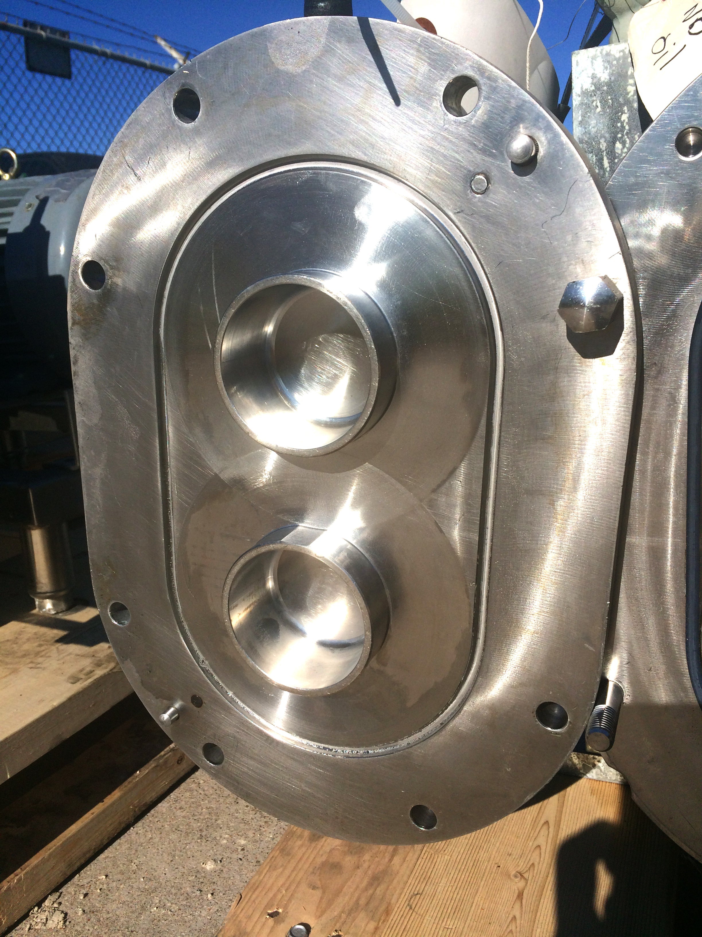 Bomba de desplazamiento positivo de lóbulos rotativos Fristam. Modelo FKL-150. Serie FKL1501004300. Presión máxima: 500 PSI. Desplazamiento por revolución: 0,259 galones. Caudal máximo: 155,4 galones por minuto a 600 RPM. Puertos: abrazadera de 3 pulg. (ACN115)