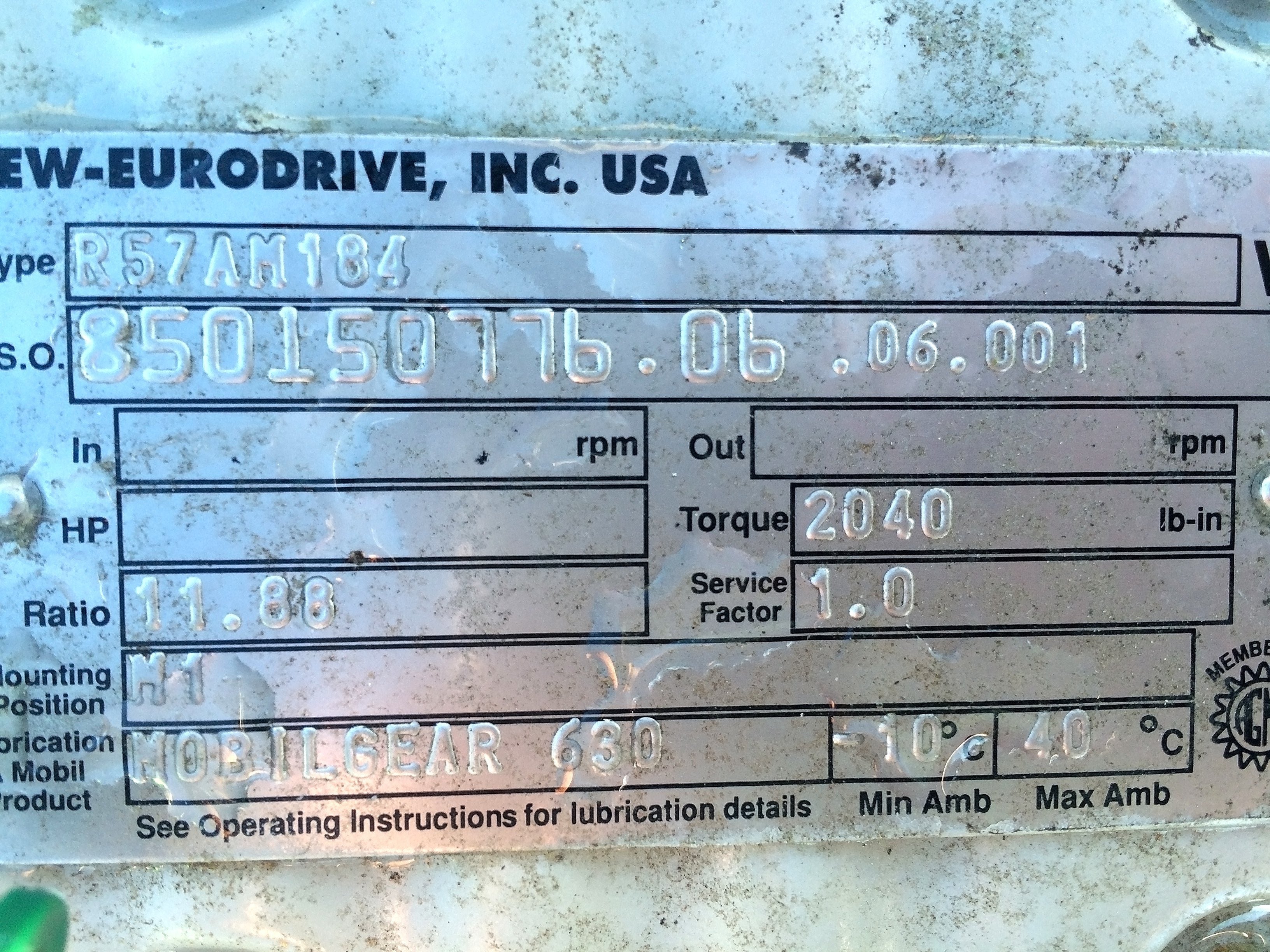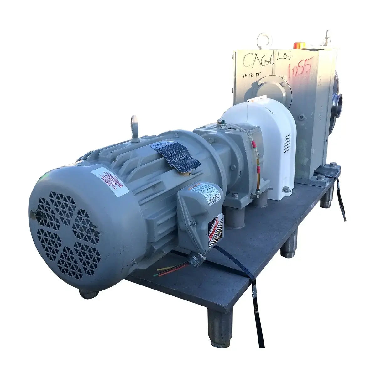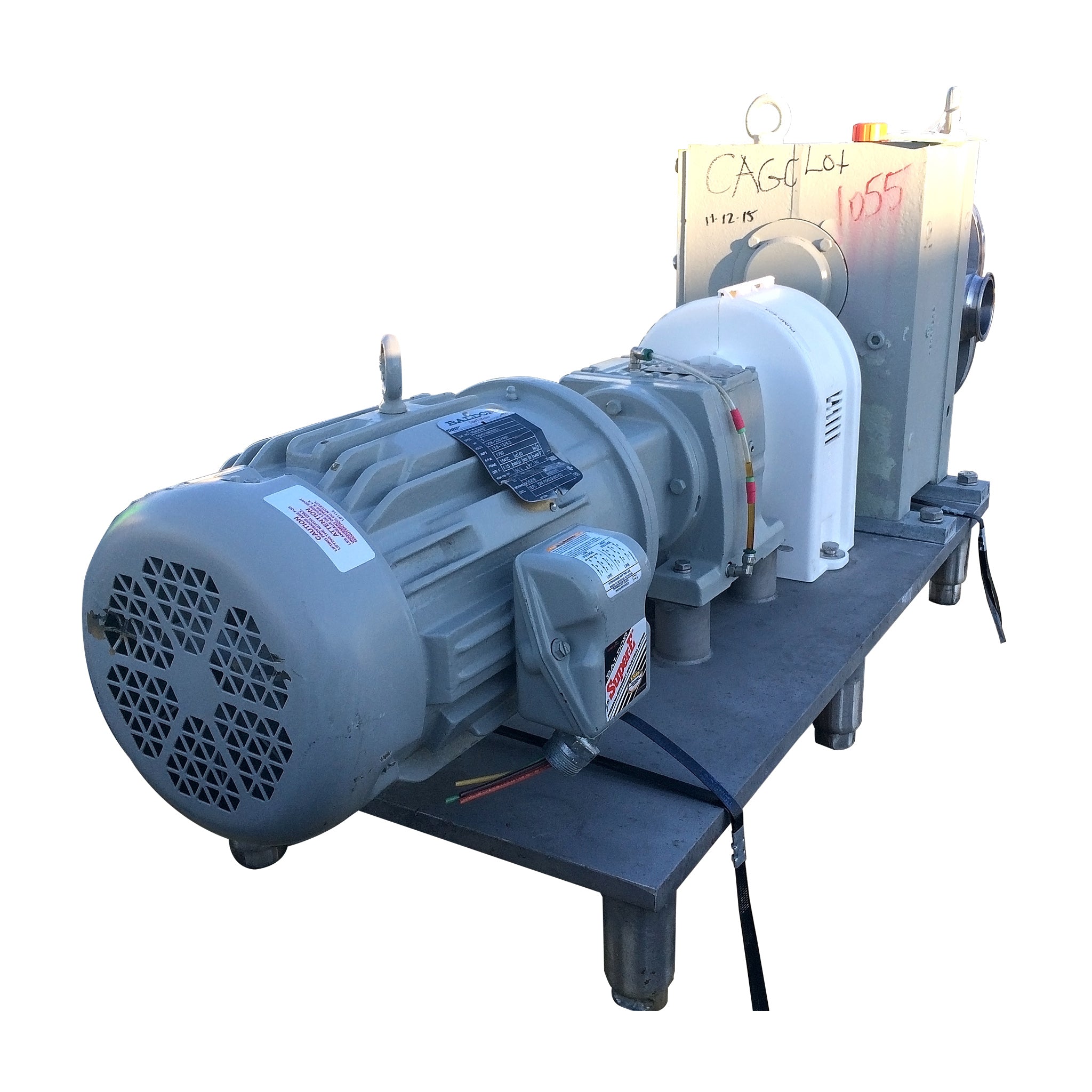 Bomba de desplazamiento positivo de lóbulos rotativos Fristam. Modelo FKL-150. Serie FKL1500601735. Presión máxima: 300 PSI. Desplazamiento por revolución: 0,259 galones. Caudal máximo: 155,4 galones por minuto a 600 RPM. Motor Baldor: 5 HP, 208-230/460 V, 13,8-13/6,5 amperios, 1750 RPM, bastidor 184TC, 60 Hz, trifásico, TEFC. Reductor de engranajes SEW-Eurodrive: relación 11,88, 147 RPM finales (38 GPM). Base de acero inoxidable. Puertos: abrazadera de 3 pulg. (ACN115)
