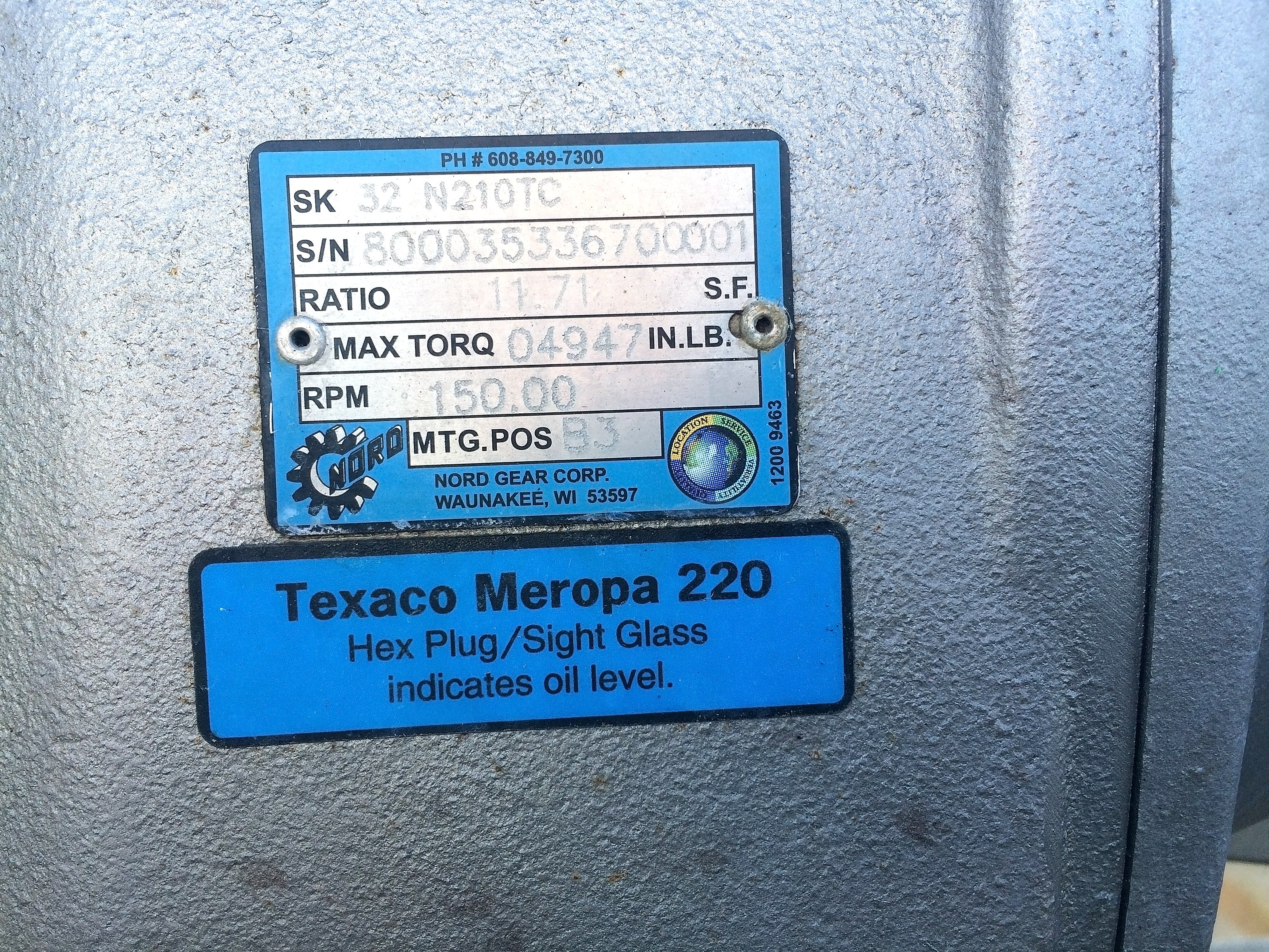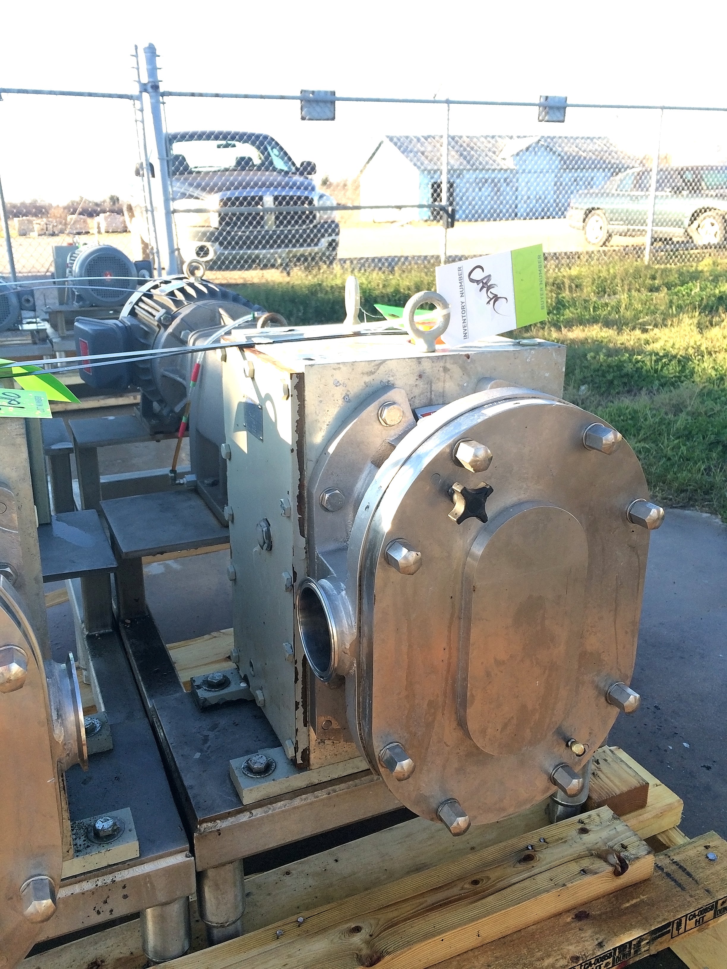 Bomba de desplazamiento positivo de lóbulos rotativos Fristam. Modelo FKL-150. Serie 007706. Presión máxima: 300 PSI. Desplazamiento por revolución: 0,259 galones. Caudal máximo: 155,4 galones por minuto a 600 RPM. Motor GE: 7,5 HP, 1755 RPM, bastidor 213TCY, 60 Hz, trifásico, TE. Reductor Nord: relación 11,71. RPM finales: 150 (38,85 GPM). Base de acero inoxidable. Puertos: abrazadera de 3 pulg. (ACN115)