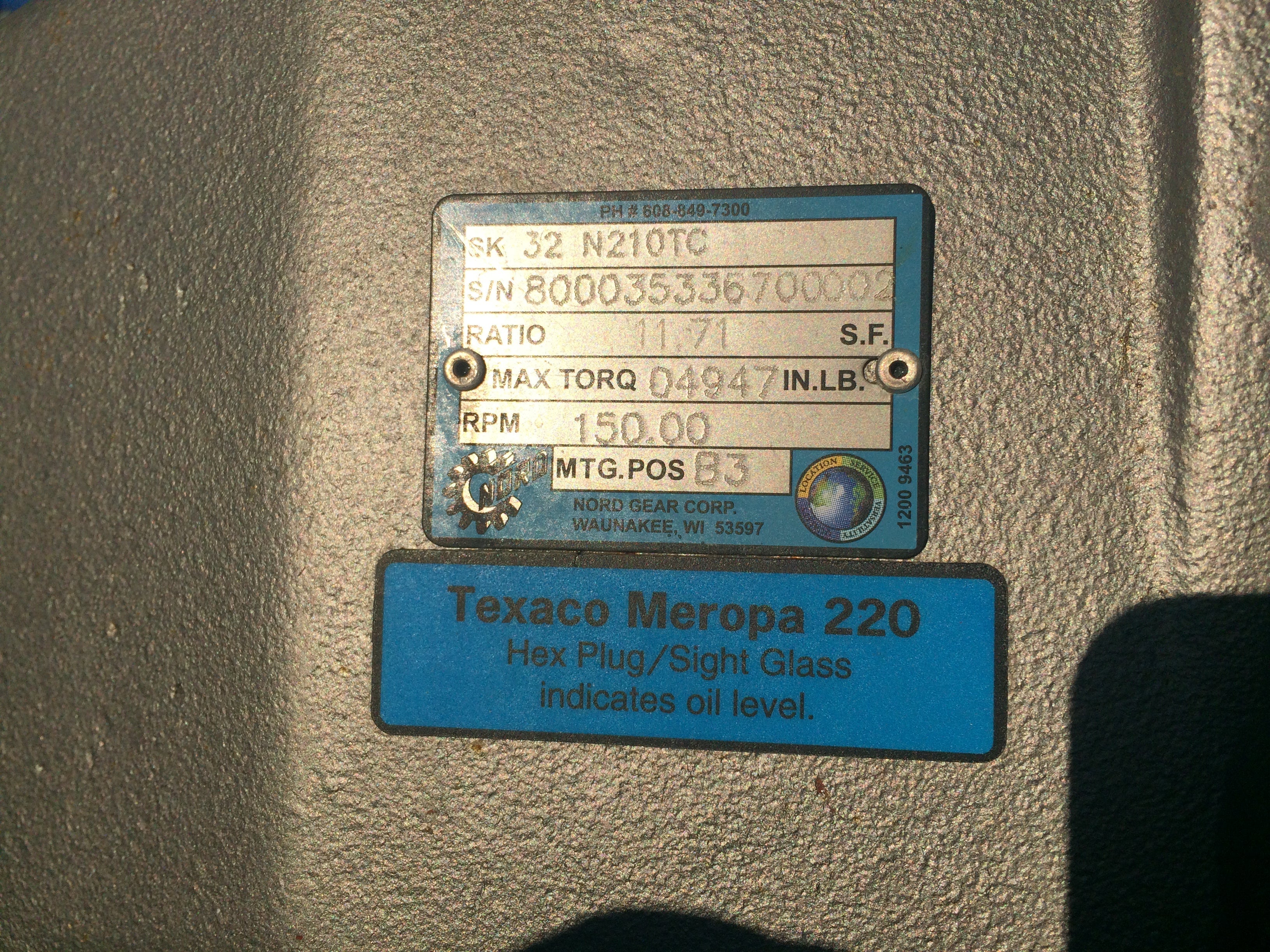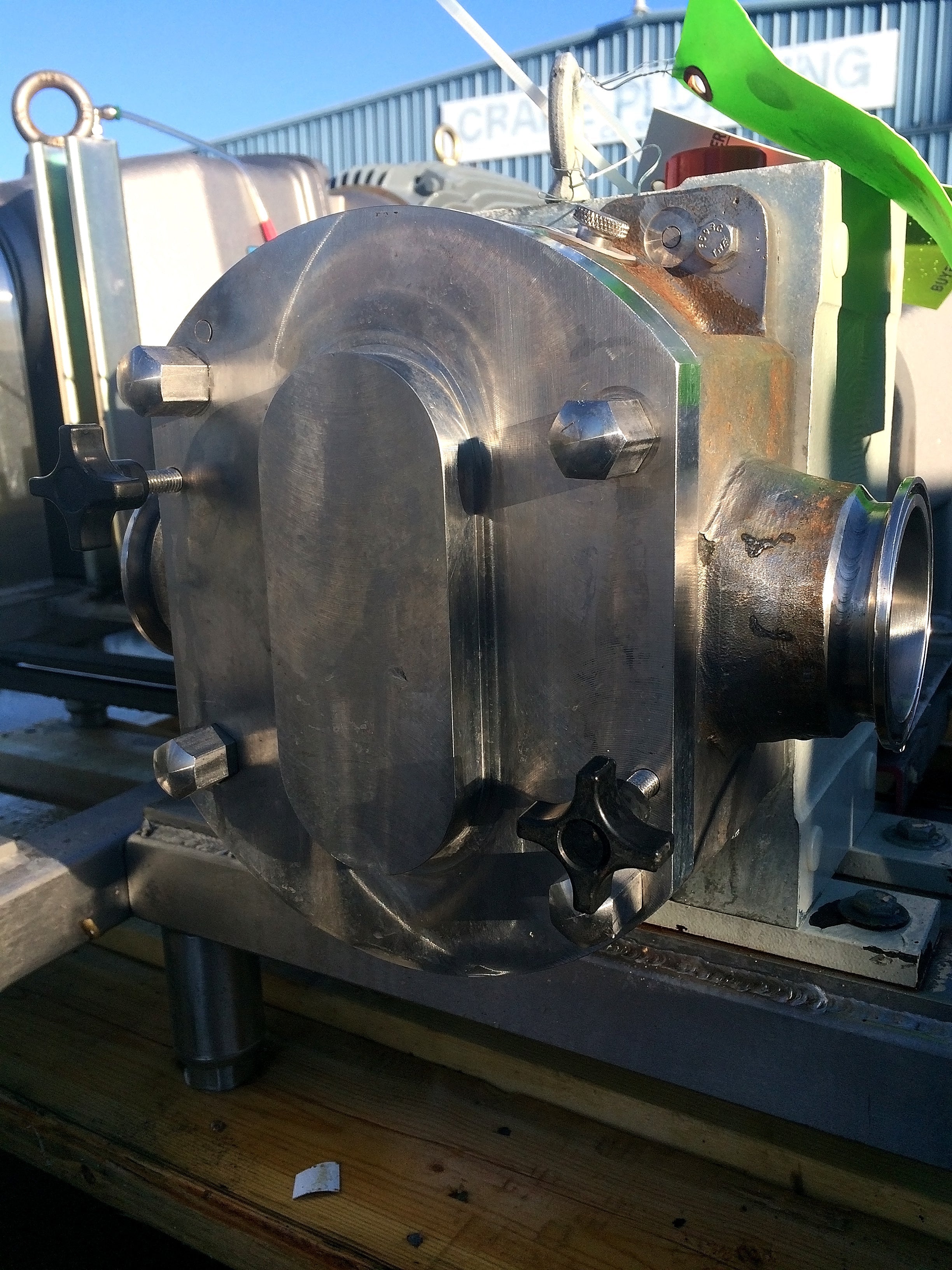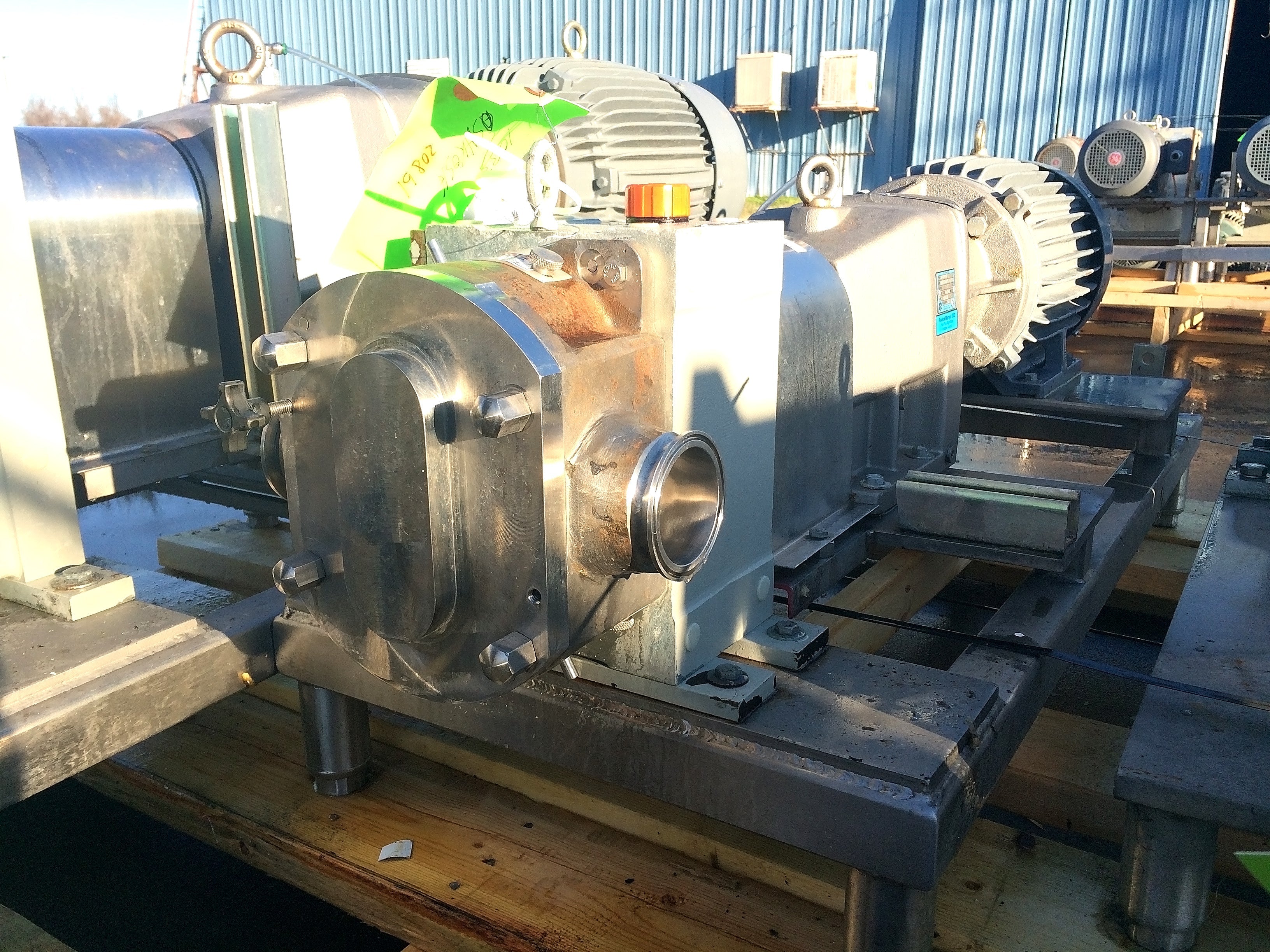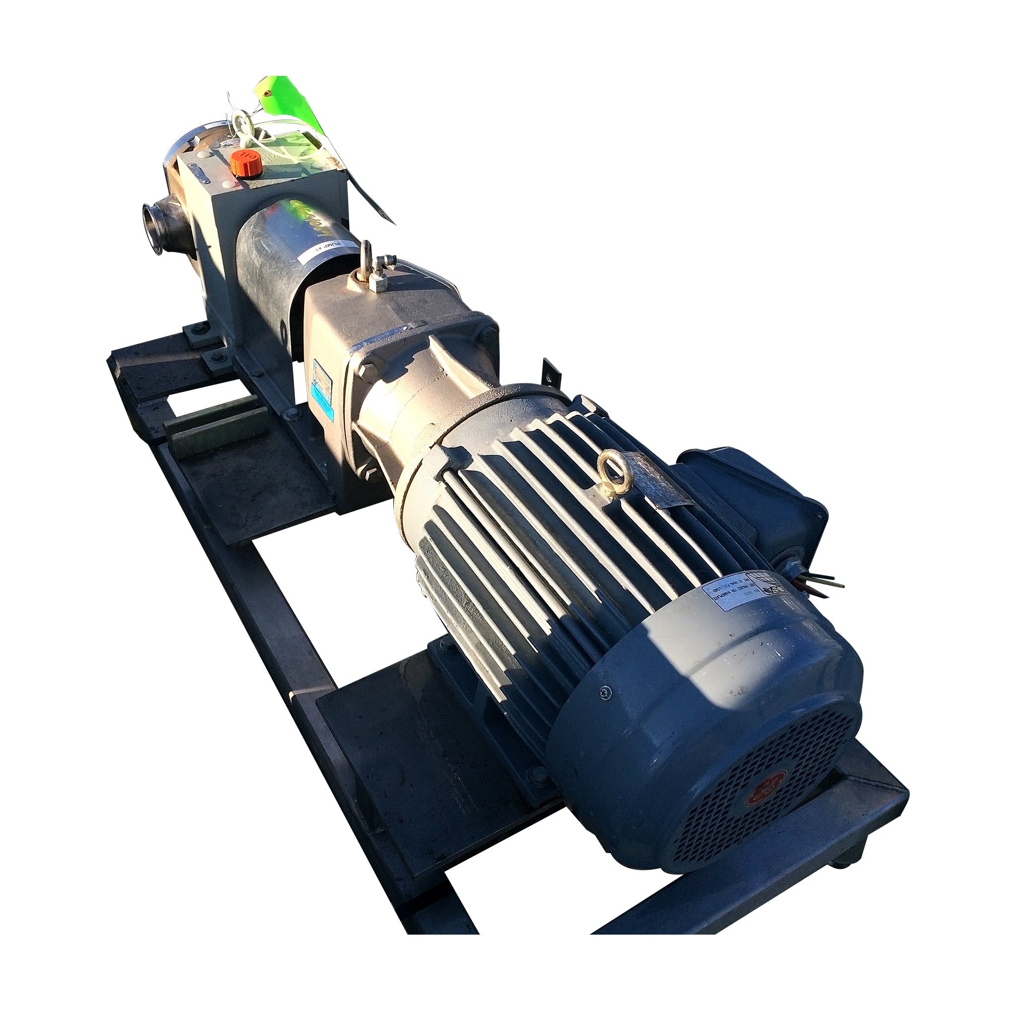 Bomba de desplazamiento positivo de lóbulos rotativos Fristam. Modelo FKL-50. Serie: 007718. Presión máxima: 300 PSI. Desplazamiento por revolución: 0,097 galones. Caudal máximo: 58,2 galones por minuto a 600 RPM. Motor GE: 10 HP, 1755 RPM, 208-230/460 V, 60 Hz, trifásico, bastidor 215 TCY. Reductor Nord: relación 11,71 (150 RPM finales, 14,55 GPM). Base de acero inoxidable. Puertos: abrazadera de 3 pulg. (ACN80)