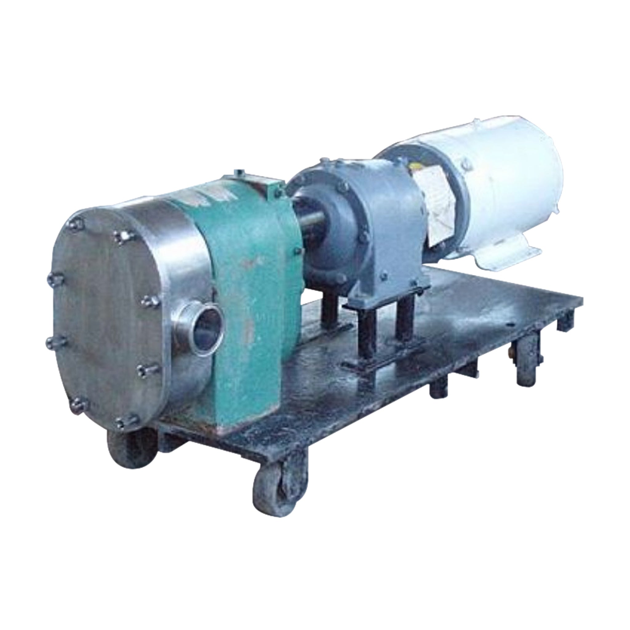 Bomba de desplazamiento positivo Tri Clover. Modelo: PR125. Capacidad máxima a 20 psi: 120 gpm. Desplazamiento por revolución: 0,30 gal. Motor industrial Baldor, 10 hp, 1760 rpm, 208-230/460 V, 28,5-28,4/14,2 amperios 60 Hz, trifásico. Transmisión, relación: 4,1, rpm fuera: 429 (final). Las bombas de desplazamiento positivo Tri-Clover manejan productos de alta viscosidad a niveles elevados de GPM y presión, brindan una vida útil más larga del sello y del rotor, reducen los costos de mantenimiento y el tiempo de inactividad, funcionan eficazmente en el servicio de elevación de succión y manejan líquidos y semisólidos con vapores arrastrados. Entradas/salidas: (2) 2-1/2 pulg. de diámetro. Accesorios de línea S. Dimensiones totales: 4 pies. 1/2 pulg. de largo x 1 pie 6 pulg. de ancho x 1 pie 6-1/2 pulg. de alto.