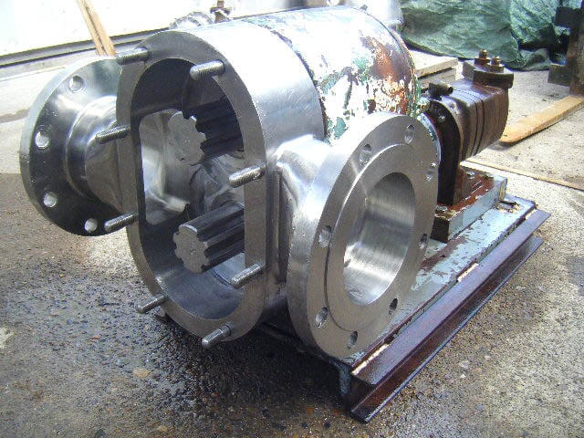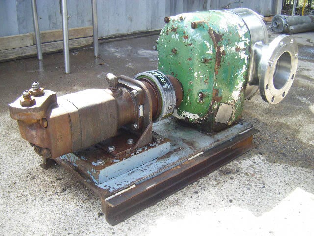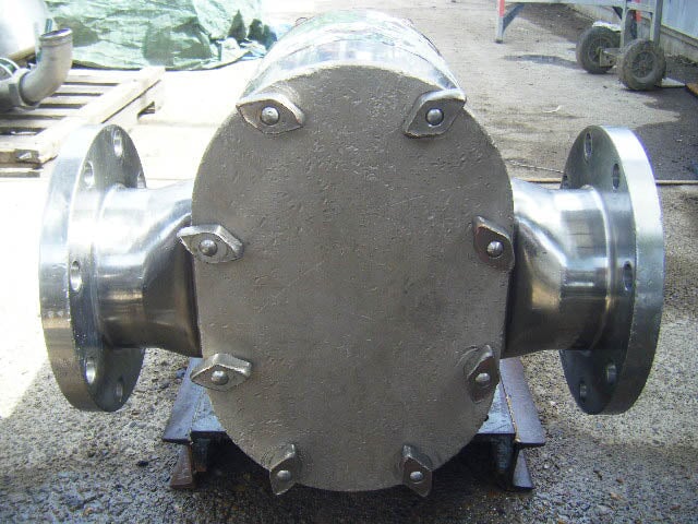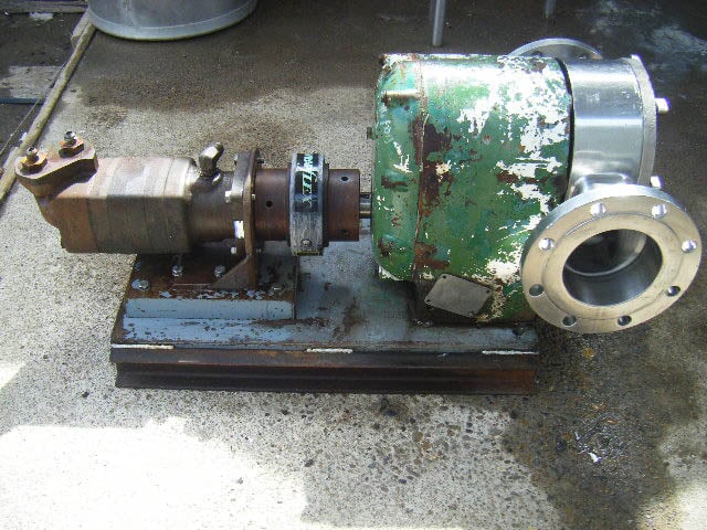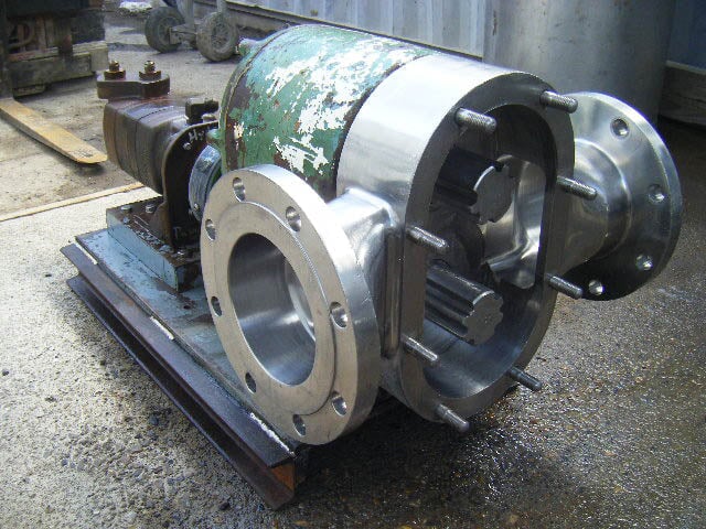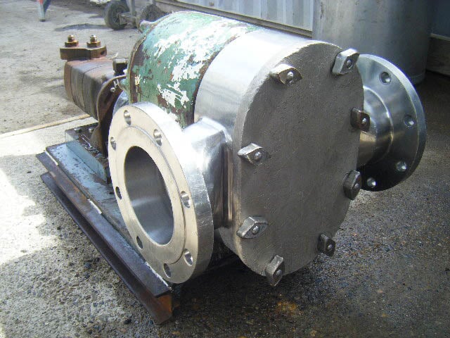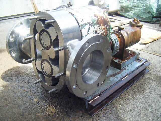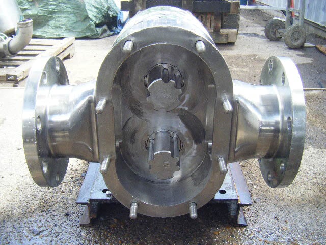 Bomba rotativa Tri Clover. Modelo: PR300. El caudal de la bomba nueva es de 300 gpm con los caballos de fuerza y la presión requeridos. Discuta con el vendedor su proceso y producto para determinar si esta bomba debe cumplir con su tarea específica. (2) rotores de 7-3/4 pulgadas. Char-Lynn Accionamiento hidráulico núm. 119 1031 003. Entrada/Salida: (2) 6 pulg. de diámetro. brida con (8) orificios de montaje de 7/8 pulg. 3-5/8 pulgadas adyacentes, 9-1/2 pulgadas opuestas. Dimensiones totales: 3 pies 8-1/2 pulgadas de largo x 1 pie 8 pulgadas de ancho x 1 pie 9-3/8 pulgadas de alto.