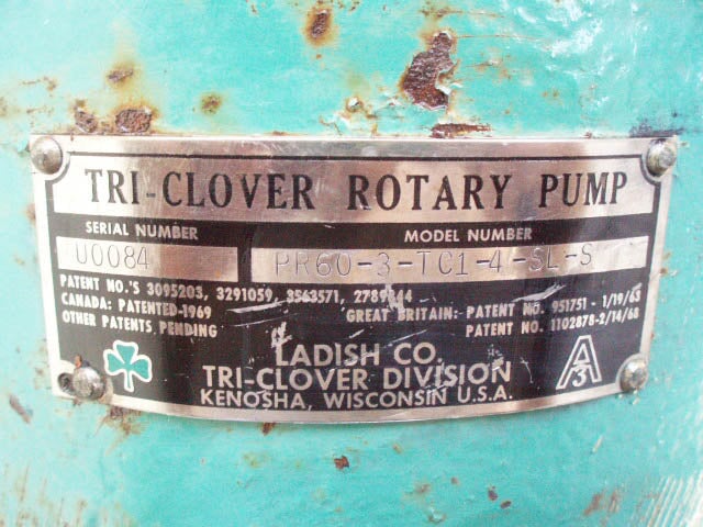 Bomba rotativa Tri Clover. Modelo: PR60-3-TC1-4-SL-S. Número de serie: U0084. Dimensiones totales: 1 pie 4-3/4 pulgadas de largo x 9 pulgadas de ancho x 1 pie 2 pulgadas de alto.