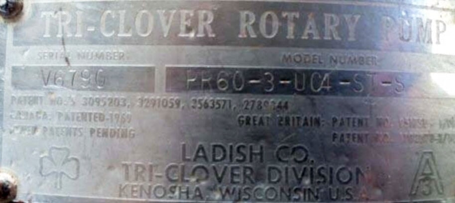 Bomba de desplazamiento positivo de lóbulos rotativos Tri-Clover PR60. Modelo: PR60-3-UC4-ST-S. Número de serie: V6790. Certificado A3. Caudal máximo (a 20 PSI): 60 GPM. Desplazamiento de la bomba: 0,175 galones por revolución. Temperatura máxima: 200F. Sellos de junta tórica estática. Placa frontal ventilada. Ladish Co. División Tri-Clover Kenosha Wisconsin, EE.UU. Tamaño del puerto: asiento biselado de 2 pulgadas. Dimensiones totales: 10,625 pulgadas de ancho x 22 pulgadas de largo x 14 pulgadas de alto.