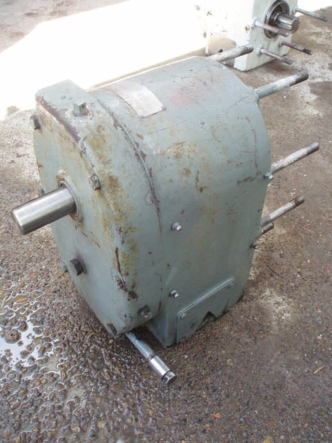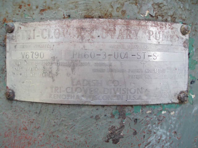 Caja de engranajes de bomba rotativa Tri-Clover. Modelo: PR60-3-UC4-ST-S. Número de serie: V6790. Dimensiones totales: 1 pie 4-3/4 pulgadas de largo x 9 pulgadas de ancho x 1 pie 2 pulgadas de alto.