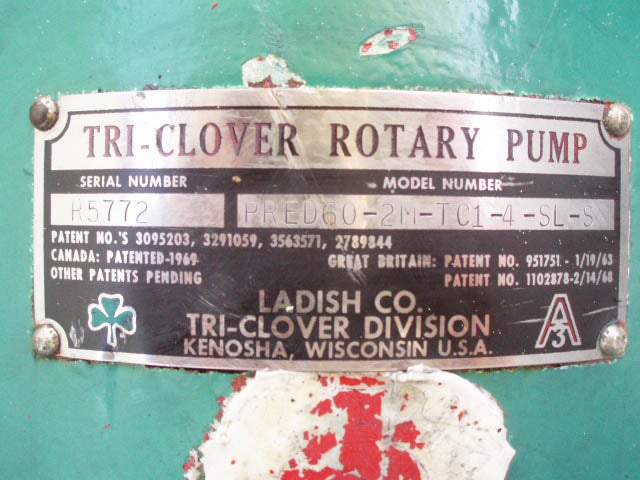 Bomba rotativa Tri Clover. Modelo: PRED60-2M-TC1-4-SL-S. Número de serie: R5772. Dimensiones totales: 1 pie 4 3/4 pulgadas de largo x 9 pulgadas de ancho x 1 pie 2 pulgadas de alto.
