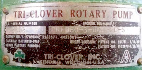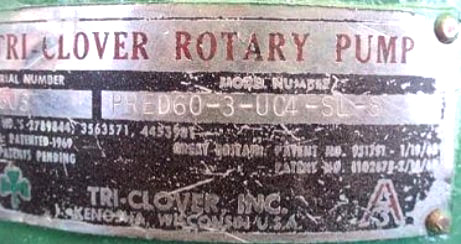 Bomba de desplazamiento positivo Tri Clover. Modelo: PRED60-3-UC4-SL-S. Número de serie: W2603. Entradas/salidas: (2) accesorios ACME de 3 pulgadas. Dimensiones totales: 1 pie 4-1/2 pulgadas de largo x 1 pie de ancho x 1 pie 2-1/2 pulgadas de alto.