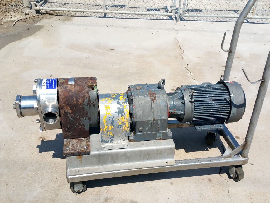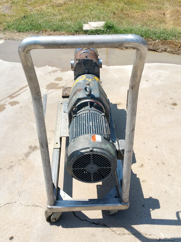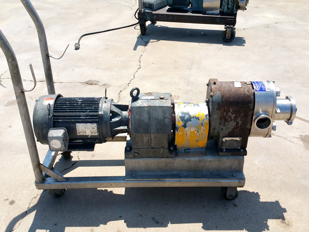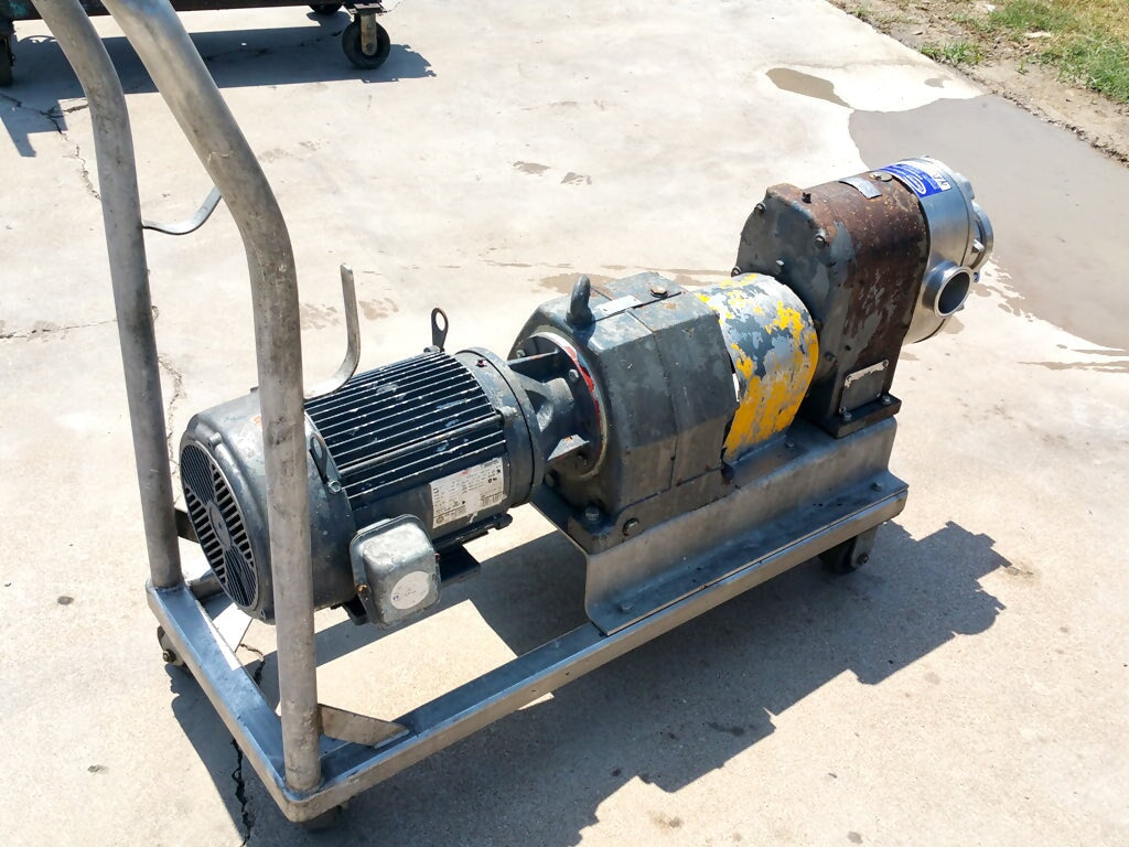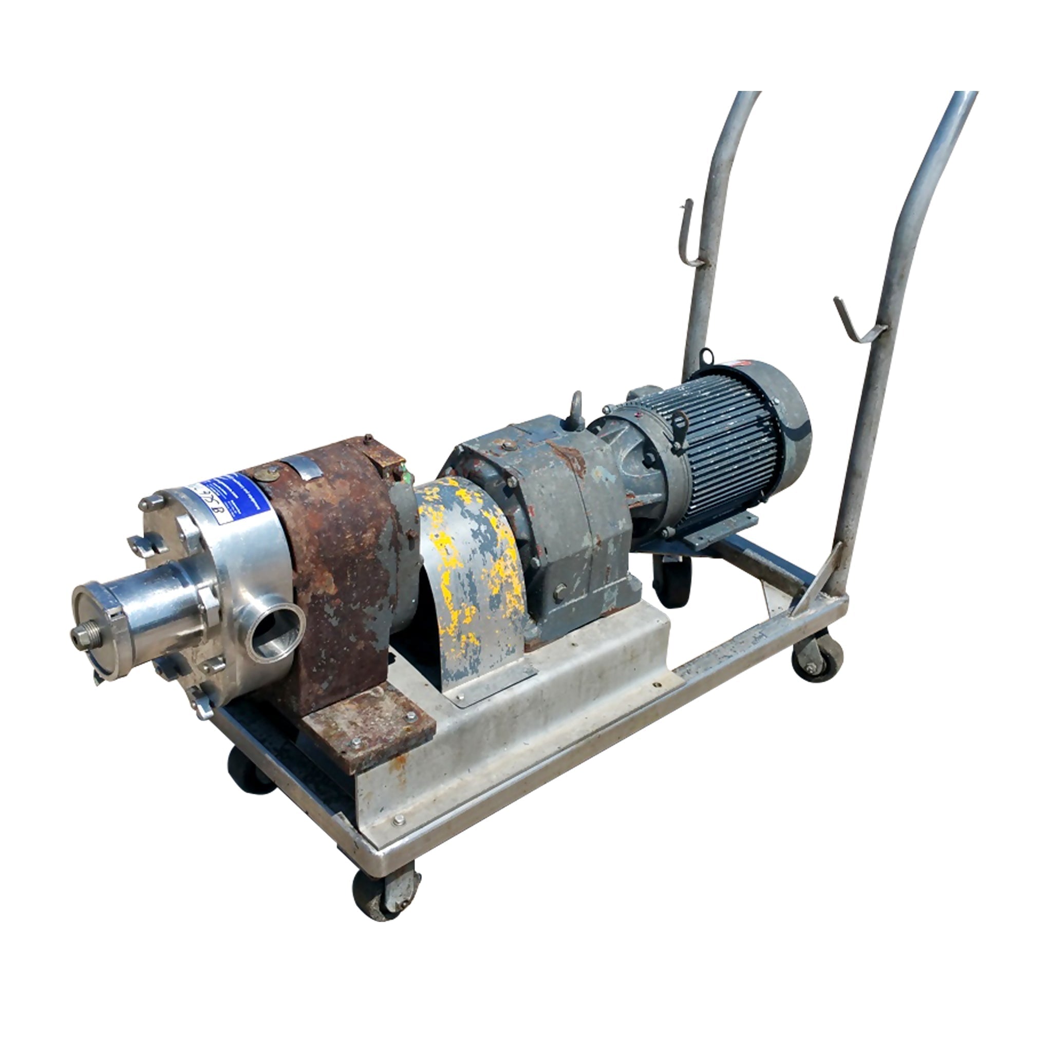 Bomba de desplazamiento positivo de lóbulos rotativos Tri-Clover. Modelo: PRR125-3M-UH4-LS-S. Serie: T1308J. Ladish Co. Caudal máximo de la bomba: 120 GPM a 20 PSI. Desplazamiento de la bomba por revolución: 0,3 galones. Incluye: rotores de 4 lóbulos de acero inoxidable, cubierta de placa frontal de alivio de presión, carro. Relación de transmisión: 18 (97 RPM finales). Motores estadounidenses: 7,5 HP, 1745 RPM, 208-230/460 V, 25/12,5 amperios, trifásicos, 60 Hz, gabinete TE. Puertos: Tri-Clamp de 3 pulg. Dimensiones totales: 5 pies de largo x 1 pie 7 pulgadas de ancho x 3 pies 11 pulgadas de alto.