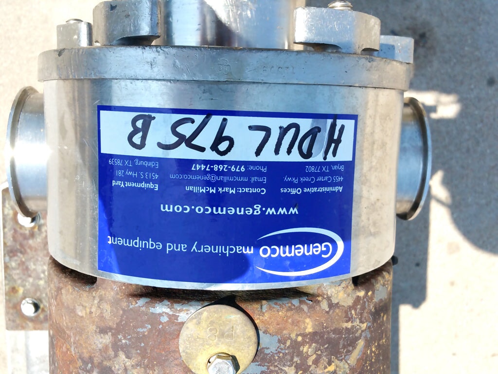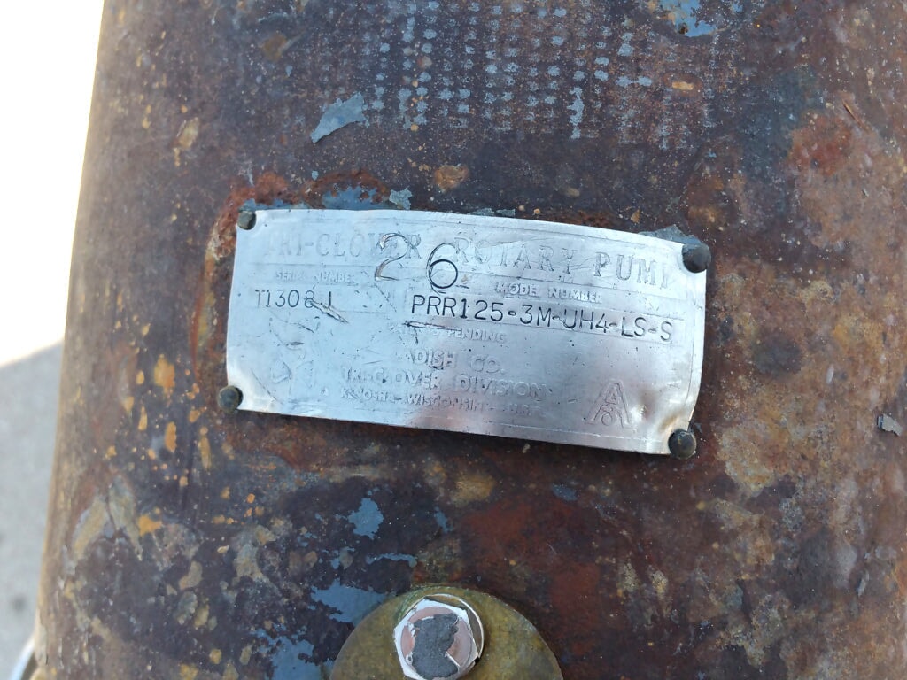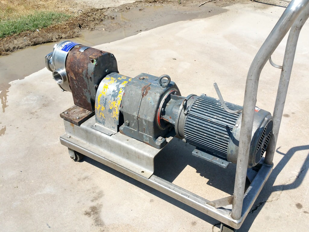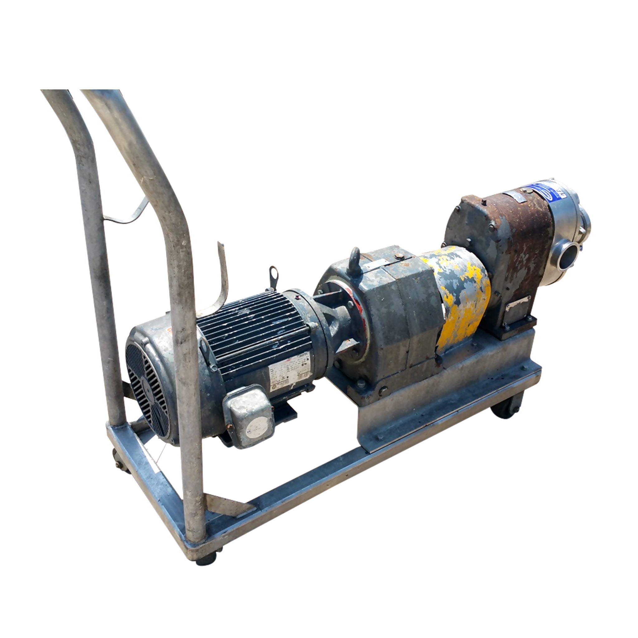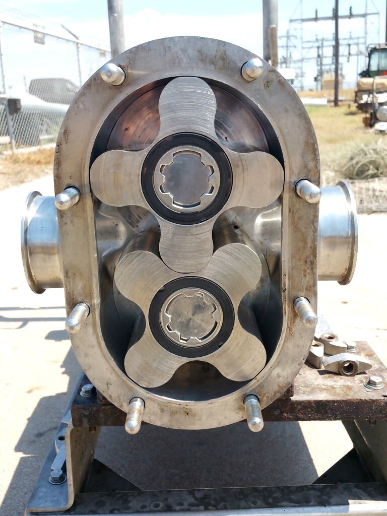 Bomba de desplazamiento positivo de lóbulos rotativos Tri-Clover. Modelo: PRR125-3M-UH4-LS-S. Serie: T1308J. Ladish Co. Caudal máximo de la bomba: 120 GPM a 20 PSI. Desplazamiento de la bomba por revolución: 0,3 galones. Incluye: rotores de 4 lóbulos de acero inoxidable, cubierta de placa frontal de alivio de presión, carro. Relación de transmisión: 18 (97 RPM finales). Motores estadounidenses: 7,5 HP, 1745 RPM, 208-230/460 V, 25/12,5 amperios, trifásicos, 60 Hz, gabinete TE. Puertos: Tri-Clamp de 3 pulg. Dimensiones totales: 5 pies de largo x 1 pie 7 pulgadas de ancho x 3 pies 11 pulgadas de alto.