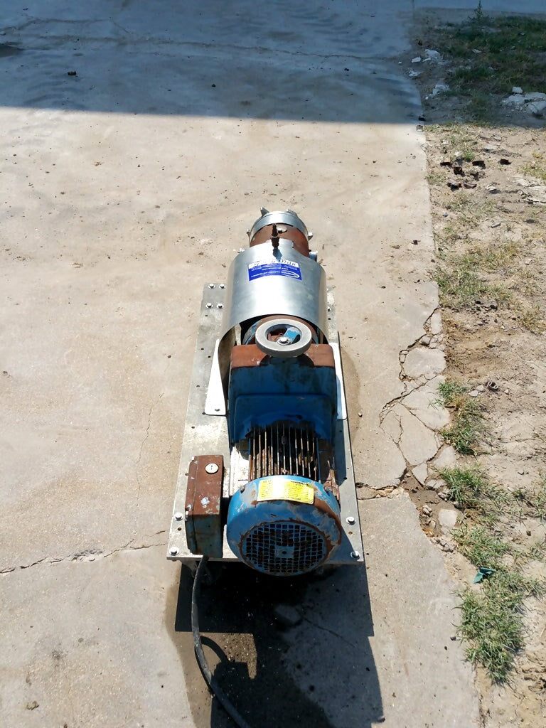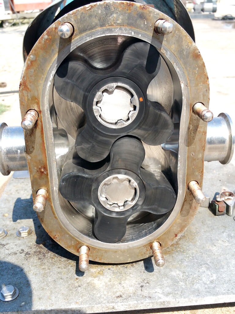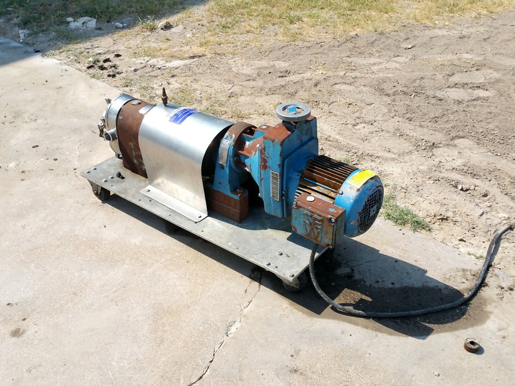 Bomba de desplazamiento positivo de lóbulos rotativos Tri-Clover. Modelo: PRR25-11/2M-TC1-4-ST-S. Serie: R1719. División Tri-Clover de Ladish Co.. Serie de relaciones públicas. Caudal máximo a 20 PSI: 28 GPM. Desplazamiento de la bomba por revolución: 0,08 galones. Incluye placa frontal de alivio de presión, rotores Buna y transmisión por engranajes ajustable. SEW Eurodrive: tipo RX61D22BDT90L4, relación 3,6, entrada 2275/455 RPM, salida: 630/126 RPM. Puertos: Conexiones S-line de 1,5 pulg. Dimensiones totales: 4 pies de largo x 1 pie 3 pulgadas de ancho x 1 pie 9 pulgadas de alto.
