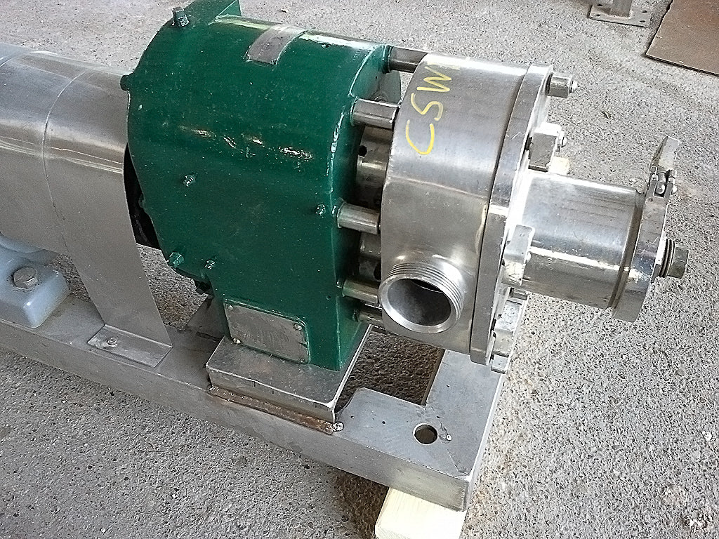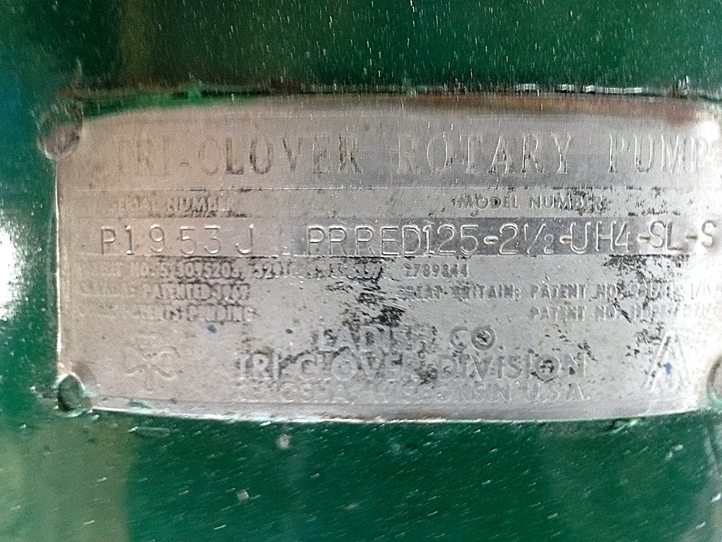 Bomba lobular rotativa de desplazamiento positivo Tri Clover. Modelo: PRRED125-2-1/2-UH4-SL-S. Número de serie: P1953J. El caudal de la bomba nueva es de 120 gpm con los caballos de fuerza y la presión requeridos. *Nota: faltan los rotores y se quitó la transmisión por engranajes. Entradas/salidas: (2) 2 ½ pulg. de diámetro. TNP. Dimensiones totales: 5 pies de largo x 1 pie 4 pulgadas de ancho x 2 pies 10 pulgadas de alto (ACN234).