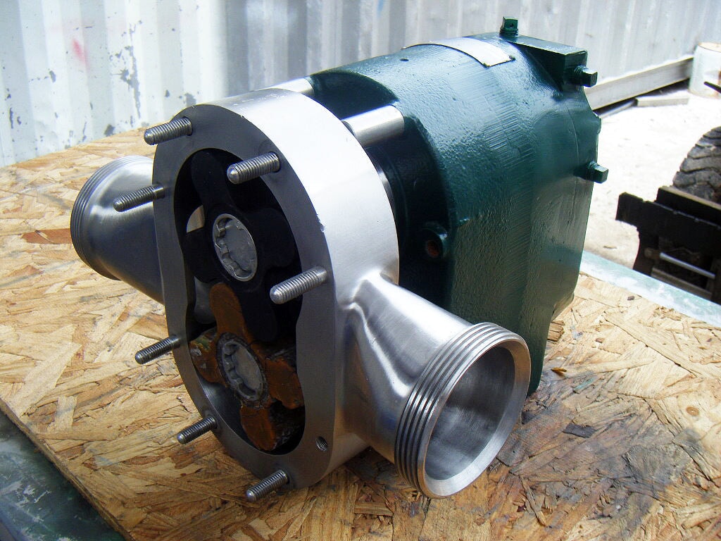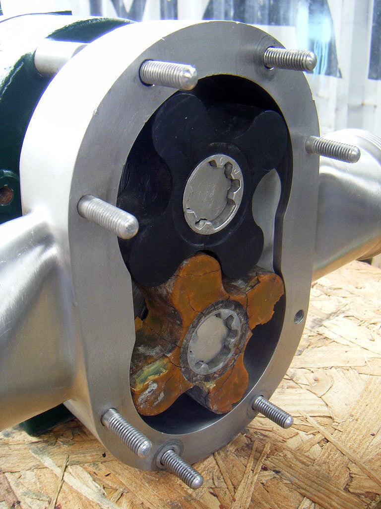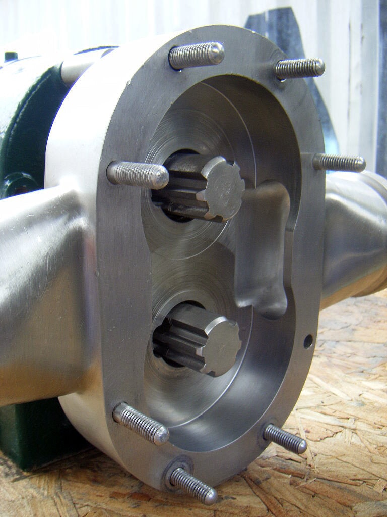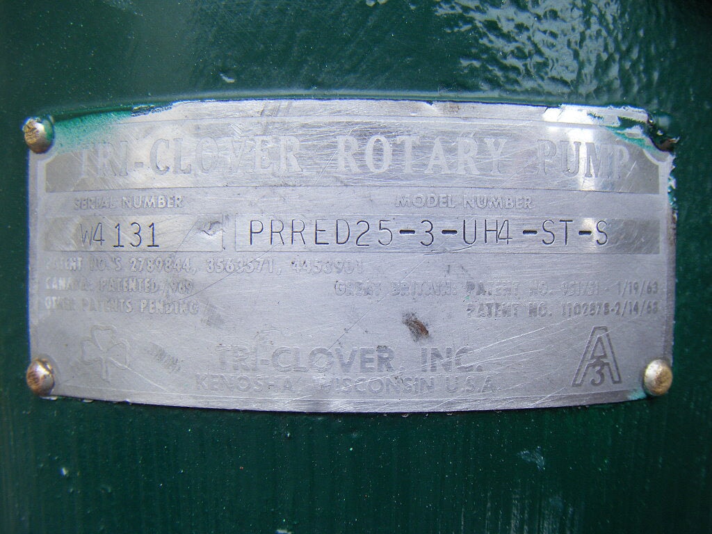 Bomba de desplazamiento positivo Tri-Clover. N º de Modelo. PRRED25-3-UH4-ST-S. Número de serie: W4131. (2) rotores de 4-1/2 pulgadas. Entrada/salida: (2) ACME de 3 pulgadas. Dimensiones totales: 1 pie 2 pulgadas de largo x 1 pie 1/2 pulgadas de ancho x 10-1/2 pulgadas de alto.