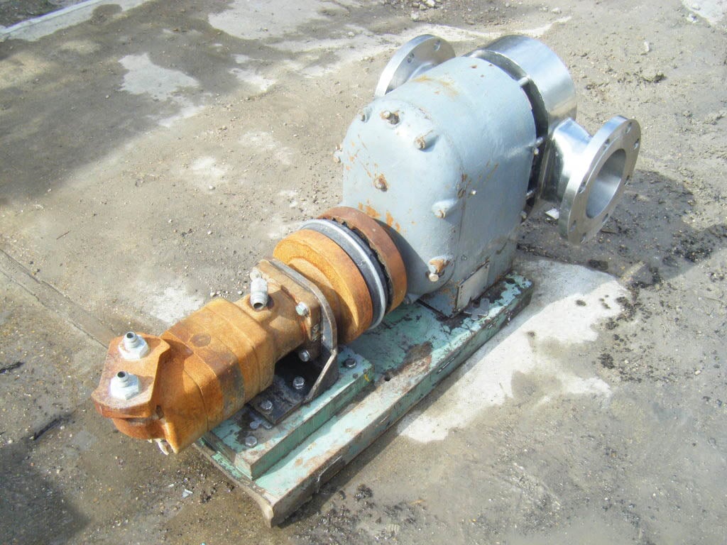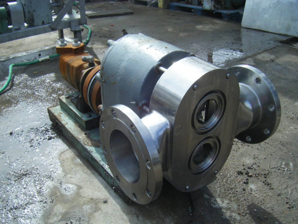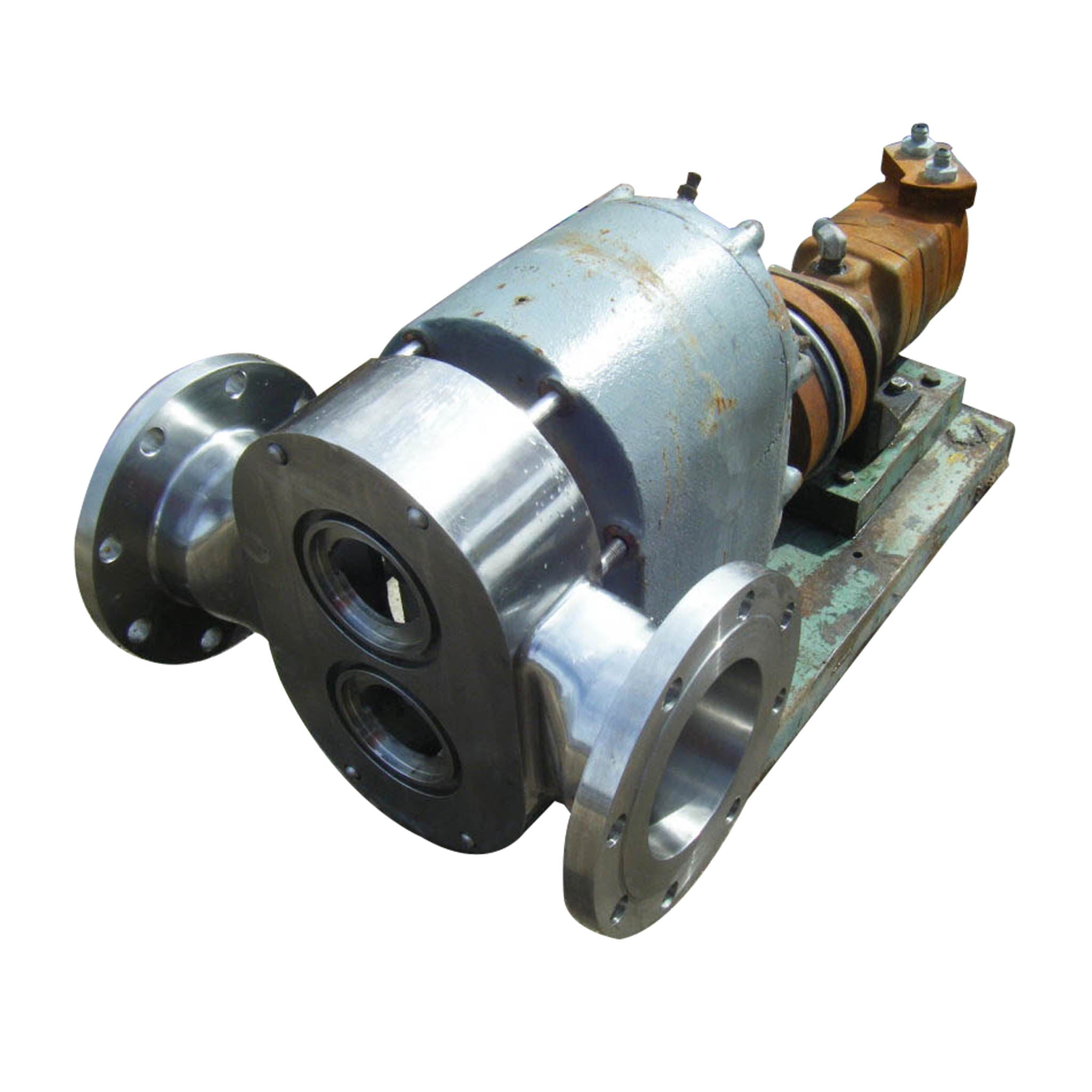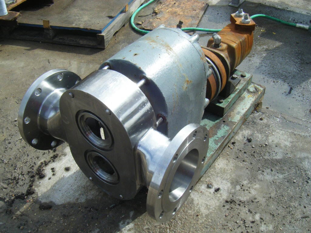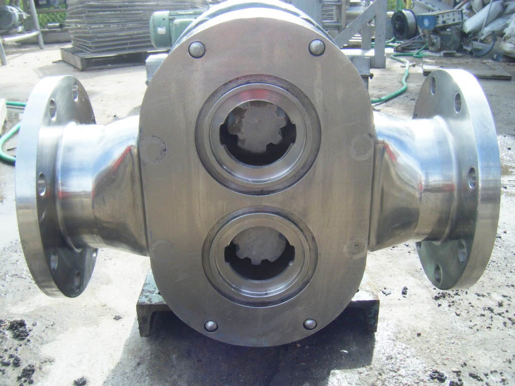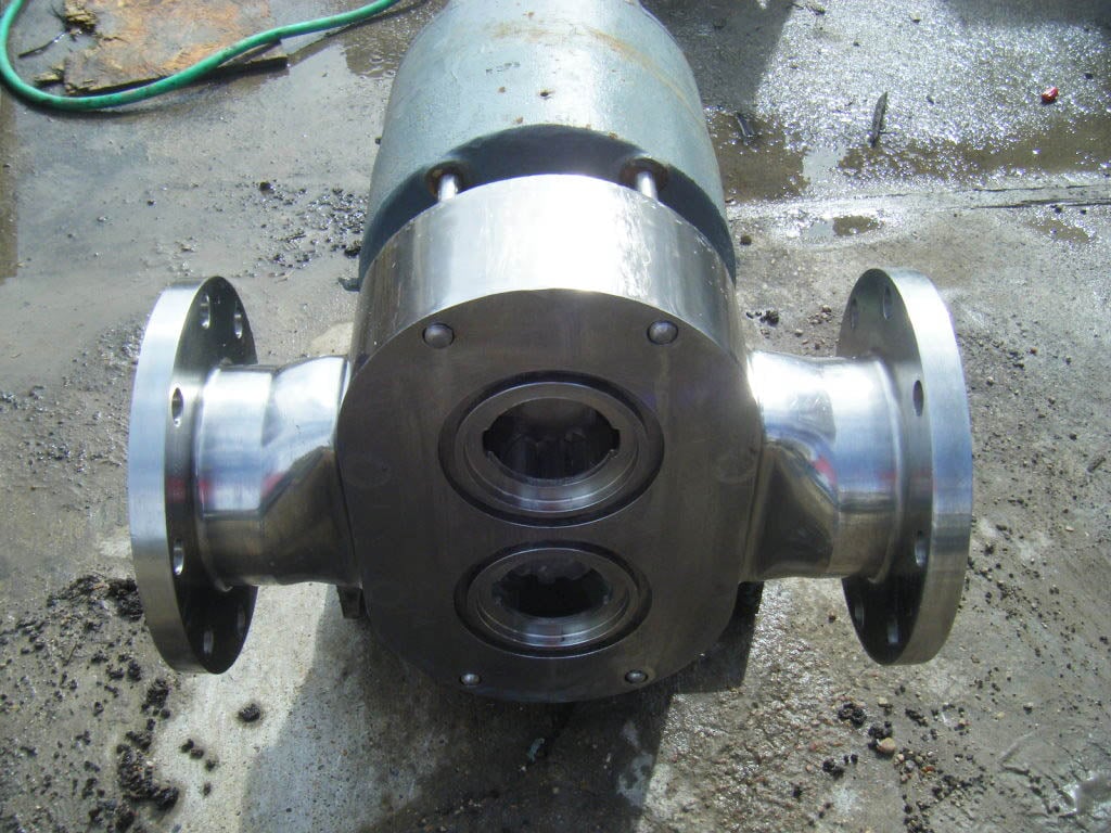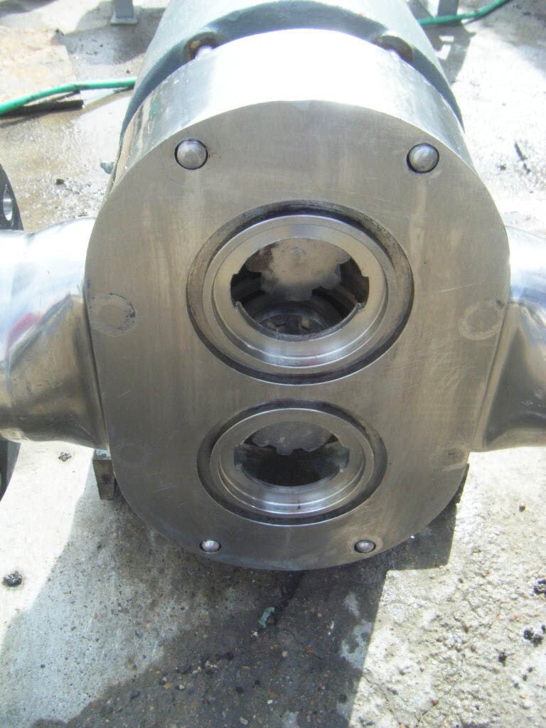 Bomba de desplazamiento positivo Tri-Clover. Rotores faltantes. Motor hidraulico. Entrada/Salida: (2) 6 pulg. de diámetro. brida. (8) orificios de montaje de 7/8 pulg. 3-5/8 pulgadas adyacentes, 9-1/2 pulgadas opuestas. Dimensiones totales: 3 pies 8 pulgadas de largo x 1 pie 8 pulgadas de ancho x 1 pie 8-1/2 pulgadas de alto.