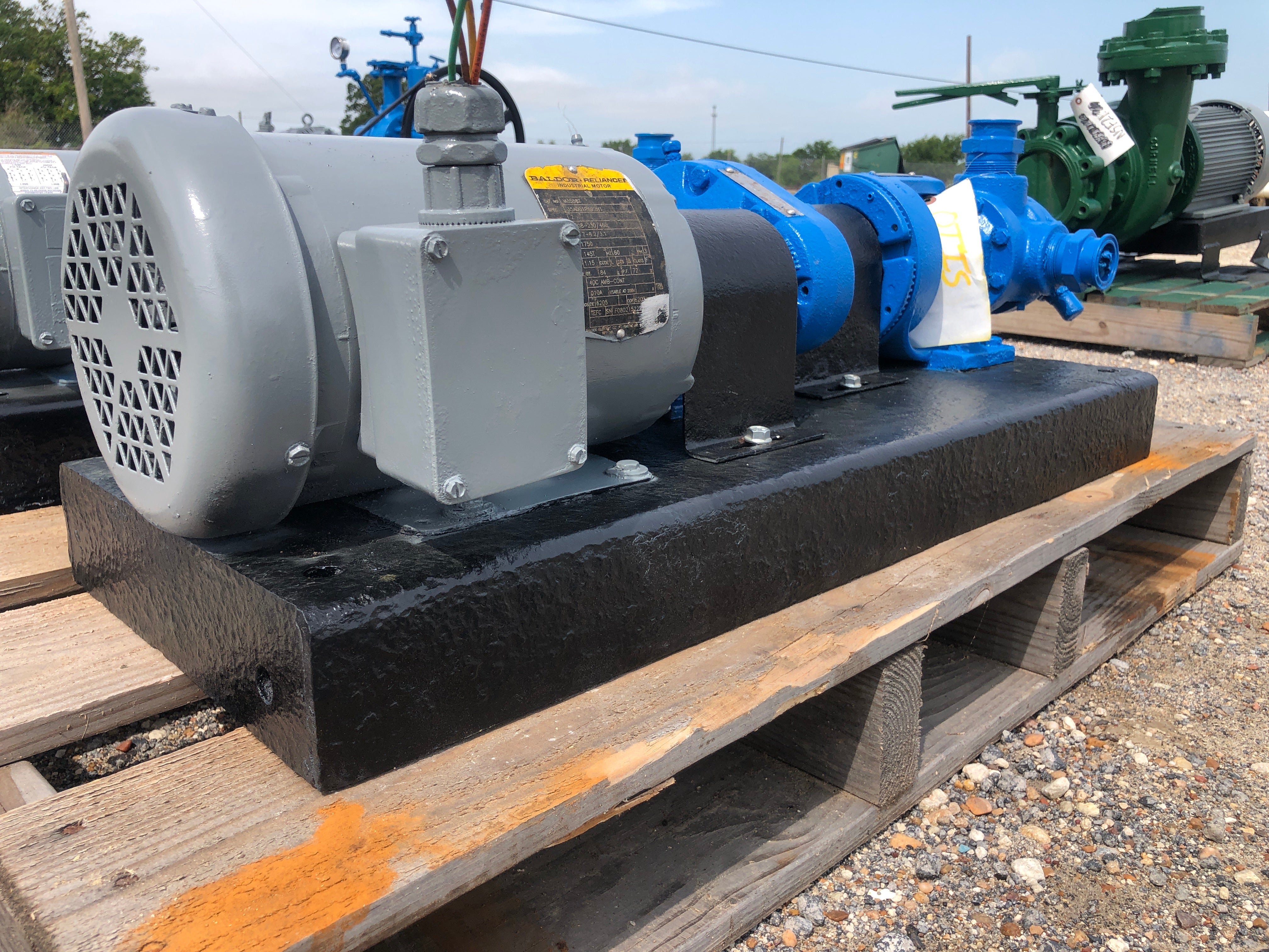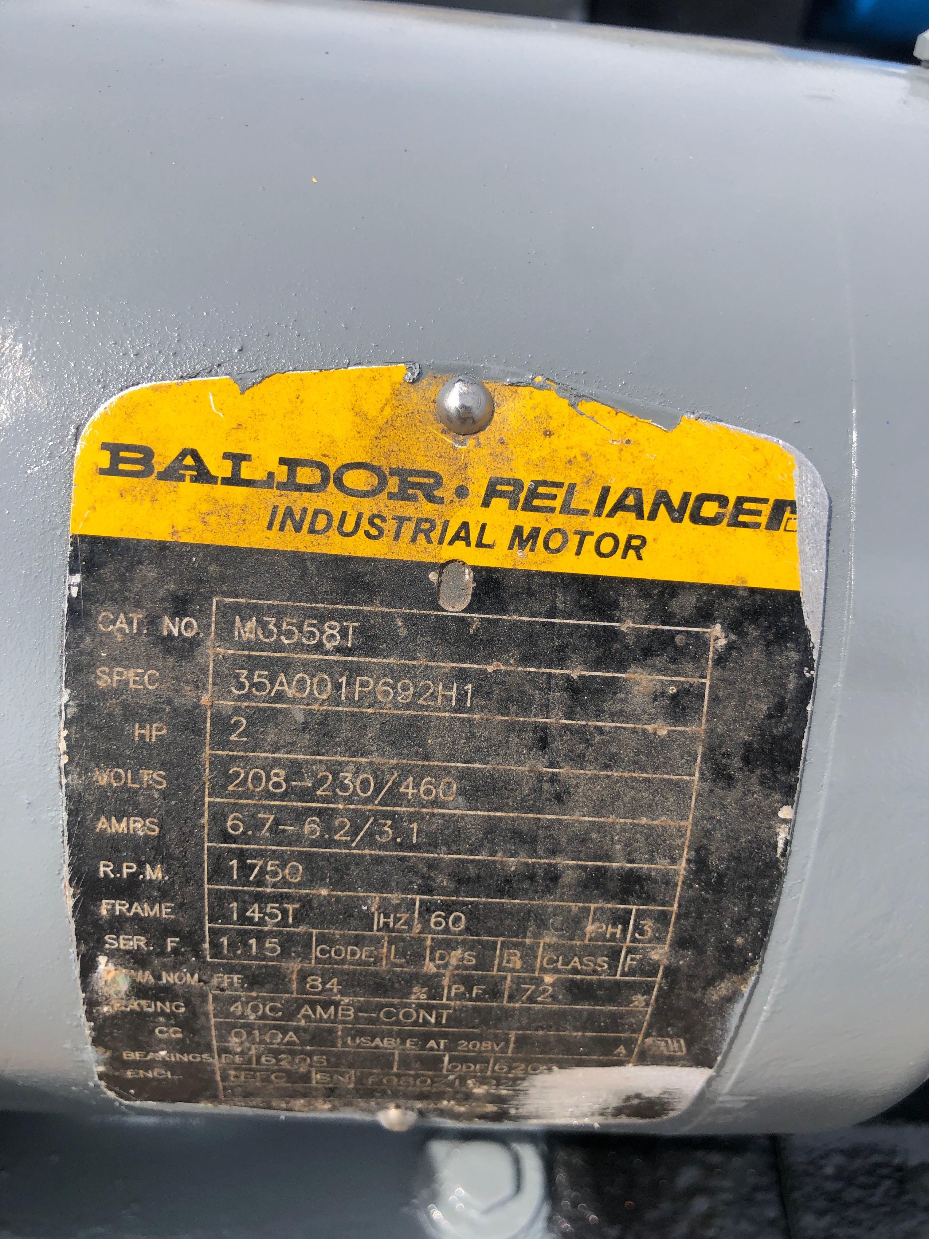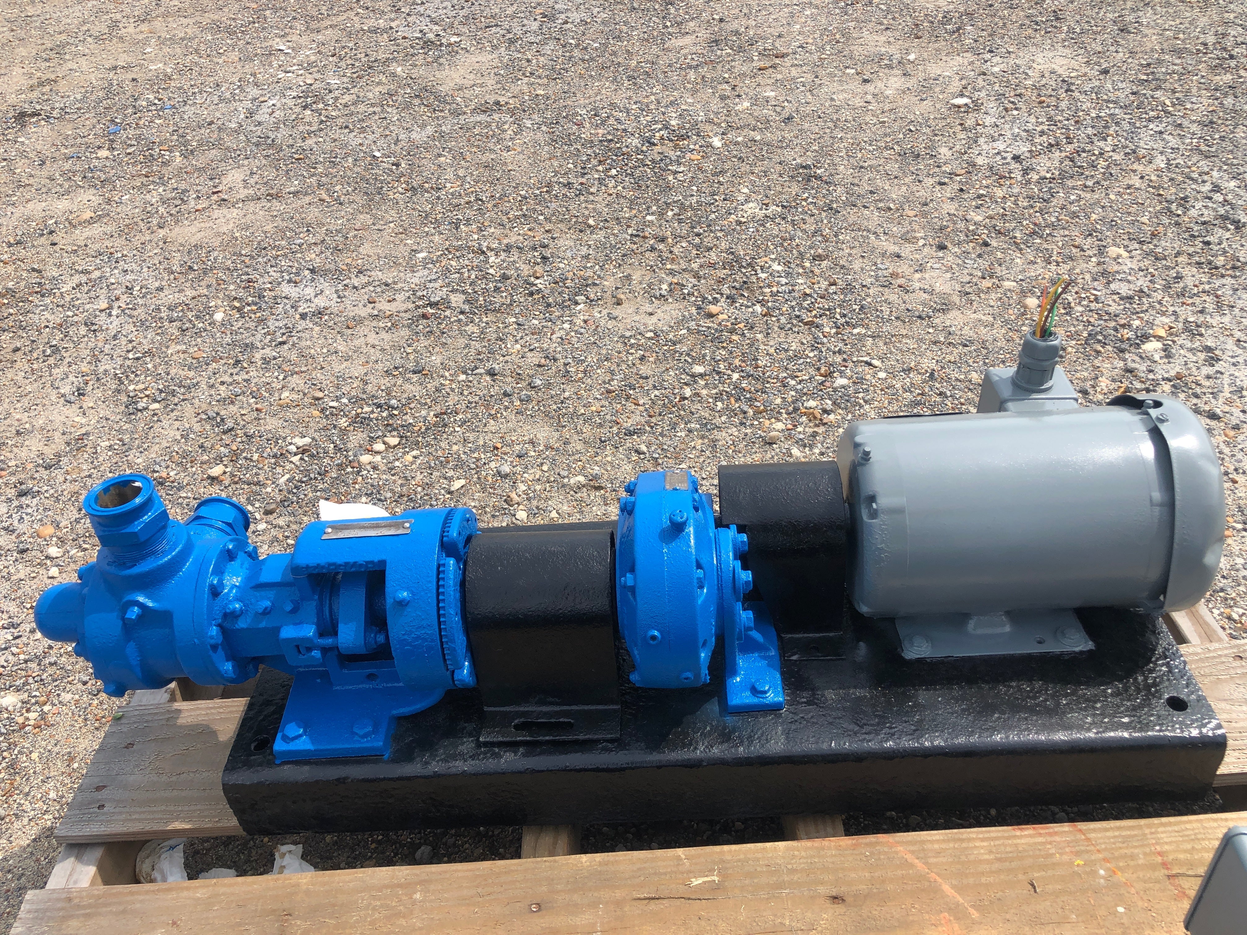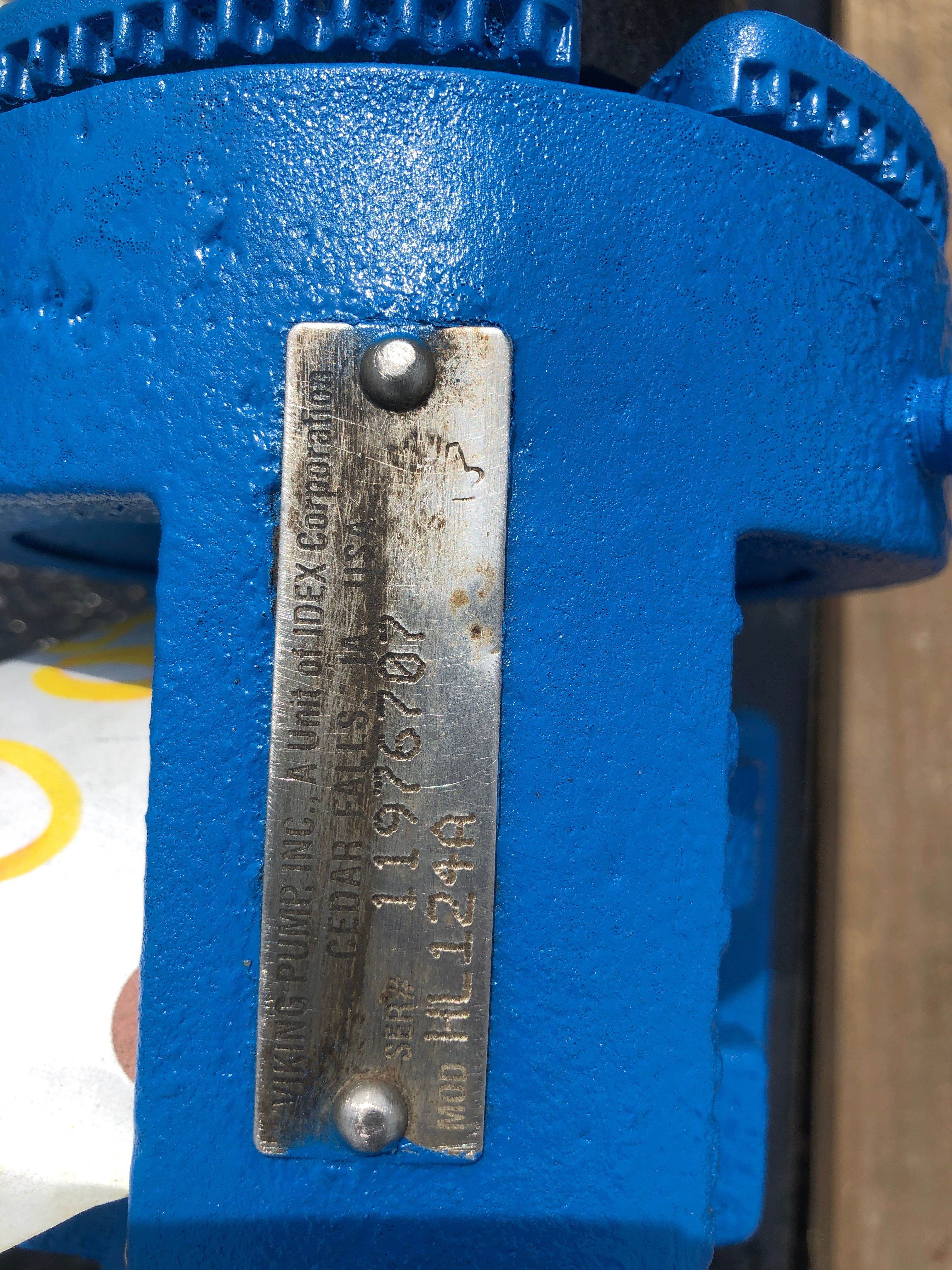 Bomba de engranajes Viking serie 4124A. Número de serie: 11976991, Número de modelo: H4124A. Clasificación nominal de la bomba: 15. Clasificación nominal de la bomba: 2,8. RPM máximas: 1750. Presión máxima: 200. Barra de presión máxima: 14. Salida y entrada de 1,5 pulgadas. La bomba y el motor han sido repintados. Motor industrial Baldor Reliance - Número de catálogo: M3558T, Especificaciones: 35A001P692H1, HP: 2, Voltios: 208-230/460, Apms: 6.7-6.2/3.1, RPM: 1750, Marco: 145T, HZ: 60.