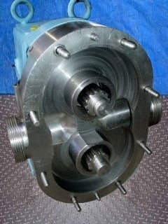 Bomba de desplazamiento positivo Waukesha 60. Modelo: 60. S/N: 8567 SS. Clasificación sanitaria A-3. Sello de junta tórica simple. Desplazamiento por revolución: 0,153 gal. Capacidad nominal: 90 gpm. 600 rpm (máx.). Rango de presión máxima: 200 psi. Flujo bidireccional, montaje de 3 vías. Aplicaciones típicas del producto: jarabes (confitería), rellenos de crema, chocolate, pastas para pastillas (farmacéuticas/cuidado de la salud), emulsiones, lechadas (lácteos), requesón y yogur. Entradas/salidas: (2) 2-1/2 pulg. de diámetro. TNP (macho). Dimensiones totales: 23 pulgadas de largo x 11 pulgadas de ancho x 14 1/2 pulgadas de alto.