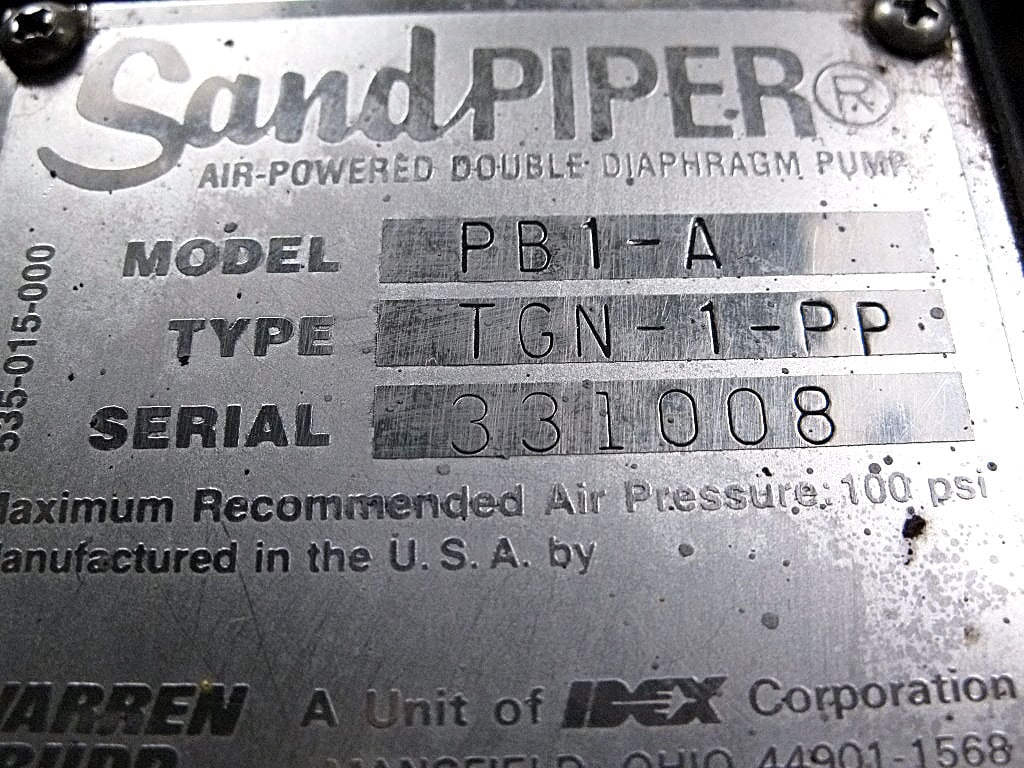 Bomba de doble diafragma Warren Rupp Sandpiper. Modelo: PB1-A. S/N: 331008. Tipo: TGN-1-PP. Presión de aire máxima recomendada: 100 PSI. Entrada: (2) 1-1/4 pulg. NPT. (1) Entrada de aire FNPT de ¾ pulg. Dimensiones totales: 1 pie 3 pulgadas de largo x 10-1/2 pulgadas de ancho x 1 pie 7 pulgadas de alto.