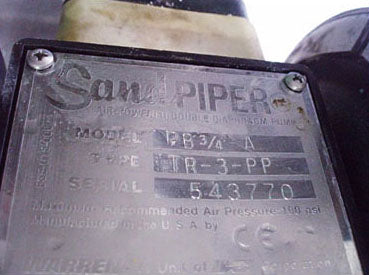 Bomba de doble diafragma accionada por aire Warren Rupp Sandpiper. Modelo: PB3/4-A. Tipo: TR-3-PP. El caudal aproximado para una bomba nueva es de 20 gpm con un flujo de aire requerido y una presión de 30 psi. Discuta con el vendedor su proceso y producto para determinar si esta bomba debe cumplir con su tarea específica. Construcción de polipropileno con diafragmas Hytrel. Límites de temperatura: 40ºF mín. y 150ºF Dimensiones totales: 1 pie 9 pulgadas de largo x 9-1/2 pulgadas de ancho x 1 pie 7 pulgadas de alto (ACN6).