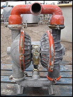 Bomba de diafragma Wilden. Modelo: 8 . Entradas/salidas: (2) 2 pulg. NPT. (1) 1 pulg. FNPT. Dimensiones totales: 1 pie 5 pulgadas de largo x 1 pie 1 pulgadas de ancho x 2 pies 3 pulgadas de alto.