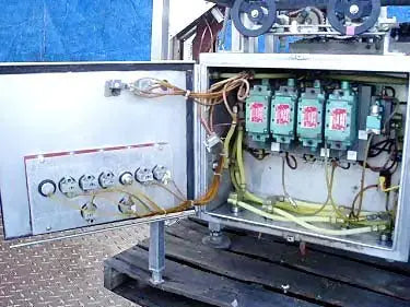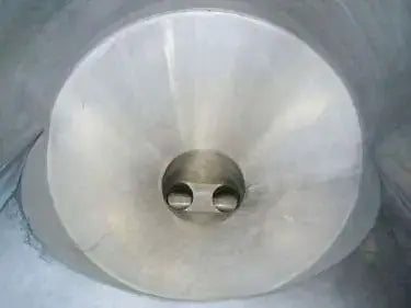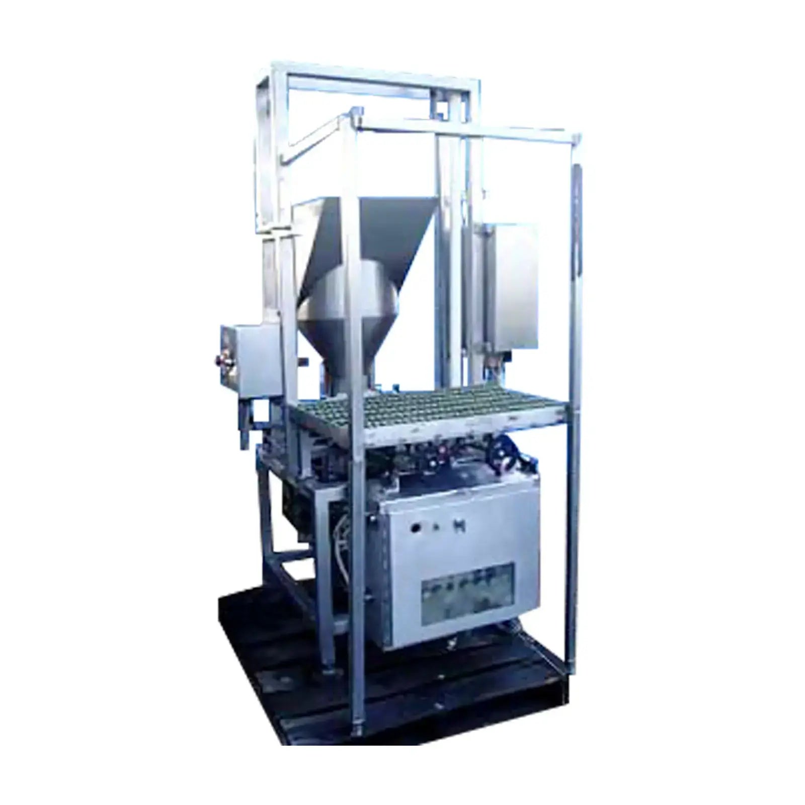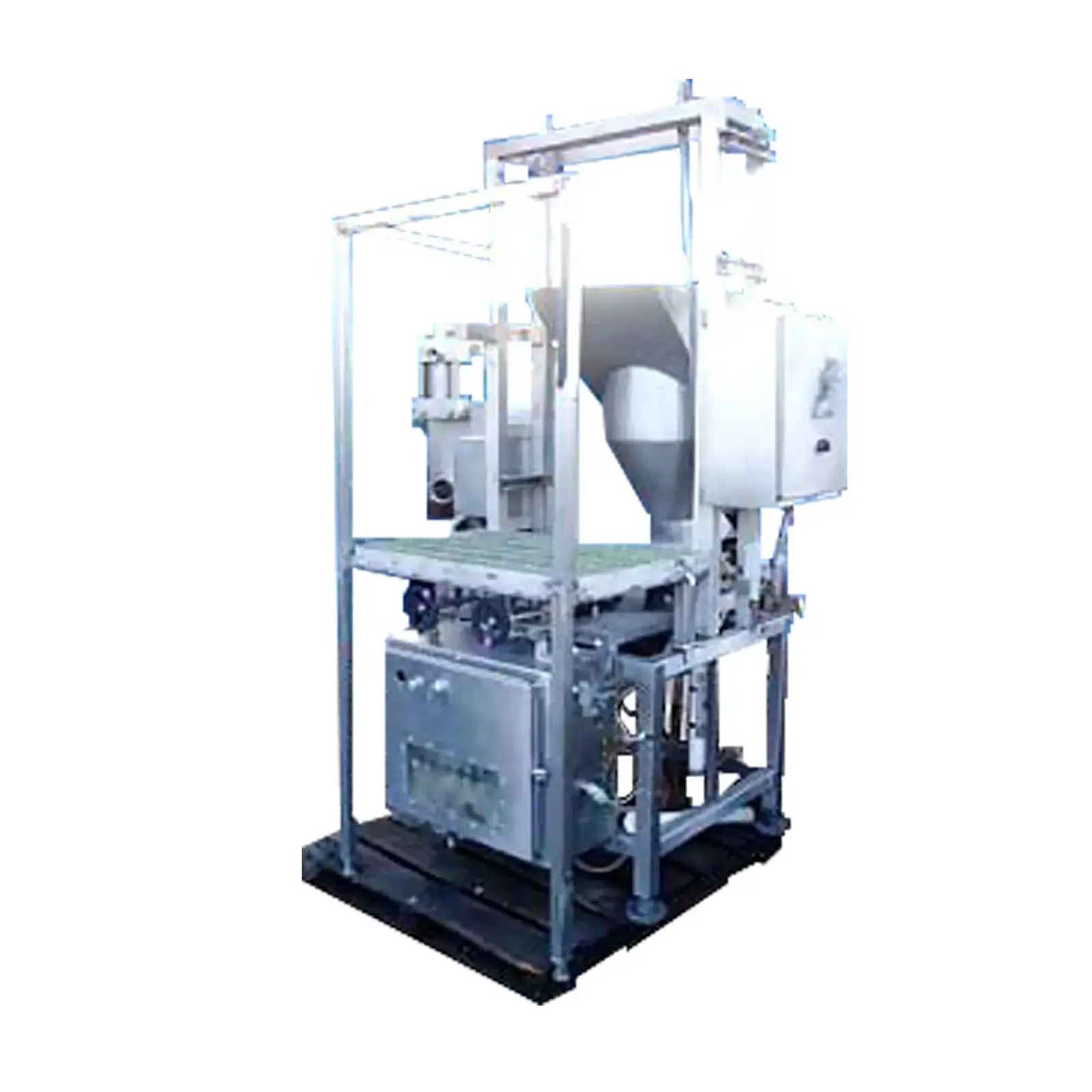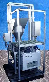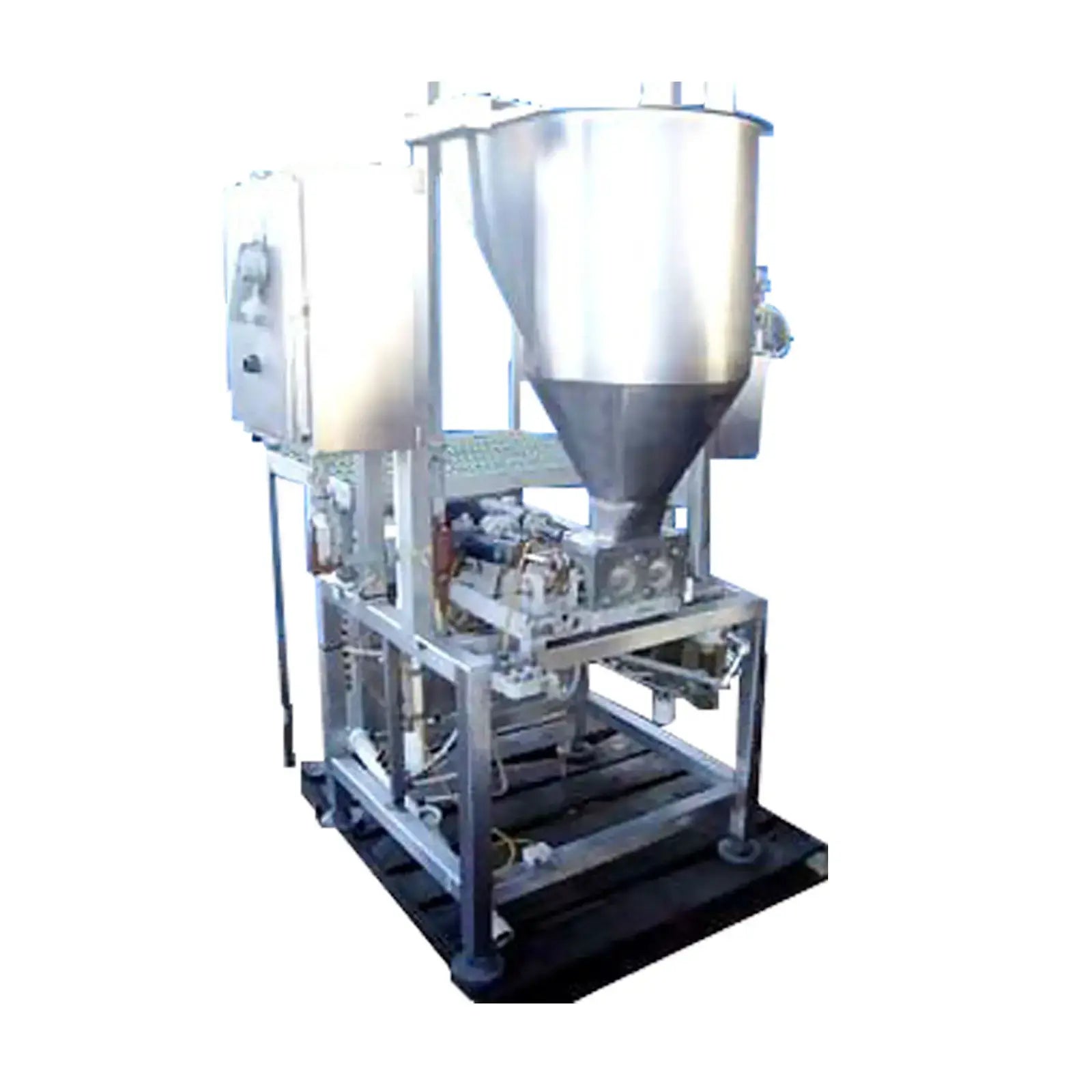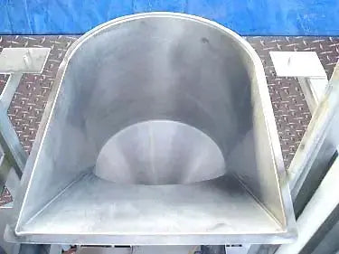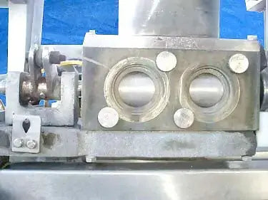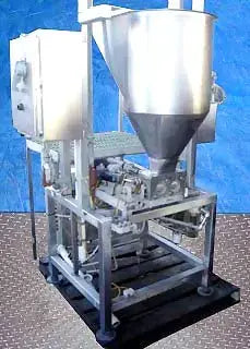 Bomba de pistón de doble cabezal de acero inoxidable. Operado neumáticamente. Diámetro de la tolva de alimentación: 18 pulg. Plataforma elevada de acero inoxidable. La bomba se utilizaba anteriormente para el procesamiento de carne. Recorrido de descarga del pistón ajustable. Flujo de aire controlado por (4) válvulas Numatics. Entradas: (1) 6 pulg. de diámetro. alimentación. Salidas: (2) puertos de descarga de 2-1/2 pulgadas. Dimensiones totales: 52 pulgadas de largo x 49 pulgadas de ancho x 86 pulgadas de alto.