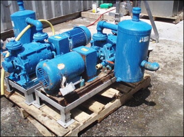 1997 Bomba de vacío de anillo líquido Kinney. Modelo: KLRC-75 KFA. El caudal de la bomba nueva es de 70 cfm y la presión es tan baja como 4 Torr (dependiendo de la presión de vapor del líquido sellador). Discuta con el vendedor su proceso y producto para determinar si esta bomba reacondicionada debe cumplir con su tarea específica. Motor: 5 CV. Tanque separador de aceite Entradas: (1) 2 pulg. de diámetro. Accesorios FNPT (succión), (1) 1 pulg. de diámetro. Accesorios FNPT (línea de agua). Salidas: (1) 2 pulg. de diámetro. Conexiones FNPT (descarga de producto), (1) 1 pulg. de diámetro. Racores FNPT (retorno de línea de agua). Dimensiones totales: 3 pies 7 pulgadas de largo x 2 pies 4 pulgadas de alto x 2 pies 5 pulgadas de alto (ACN50).