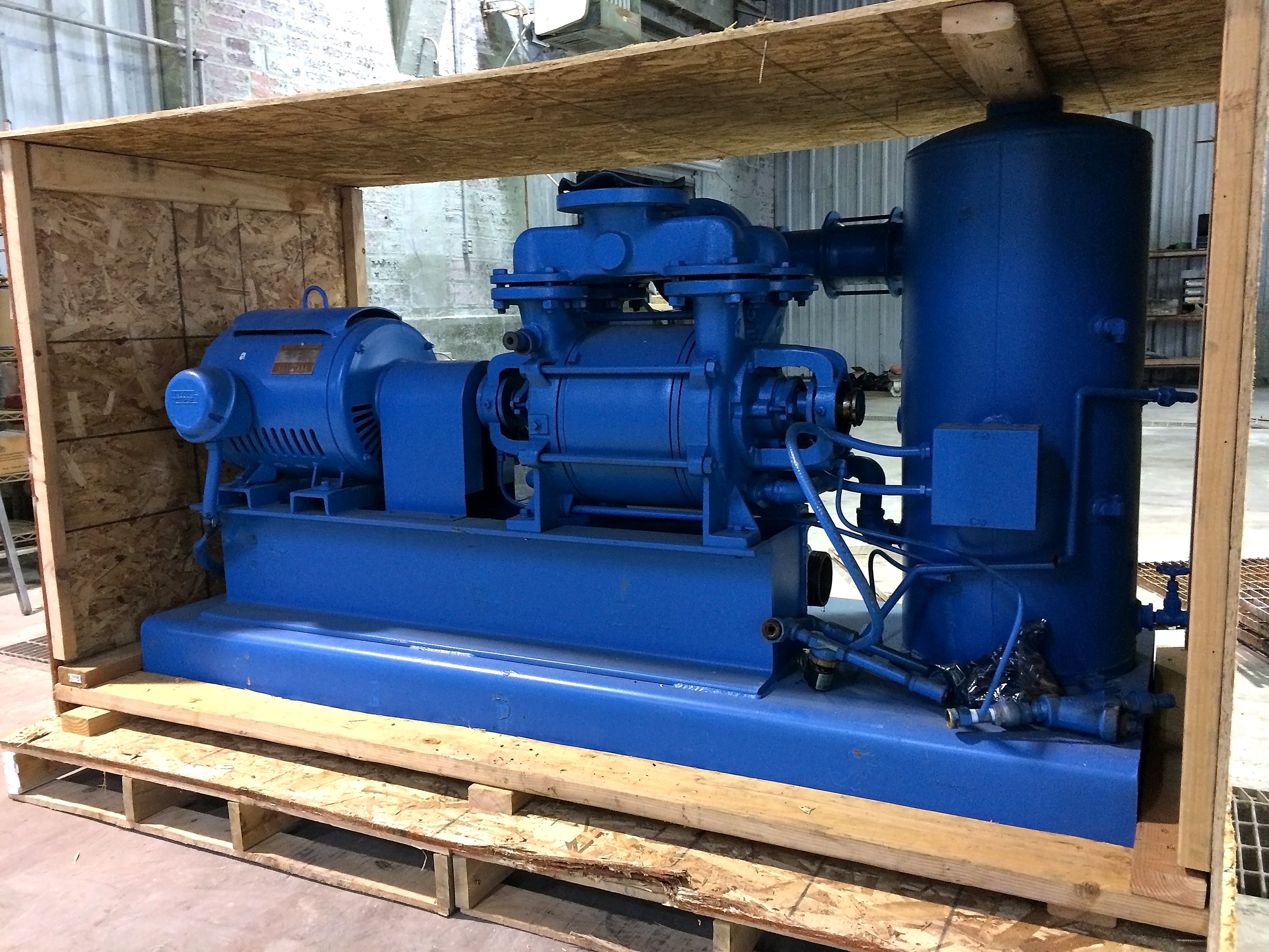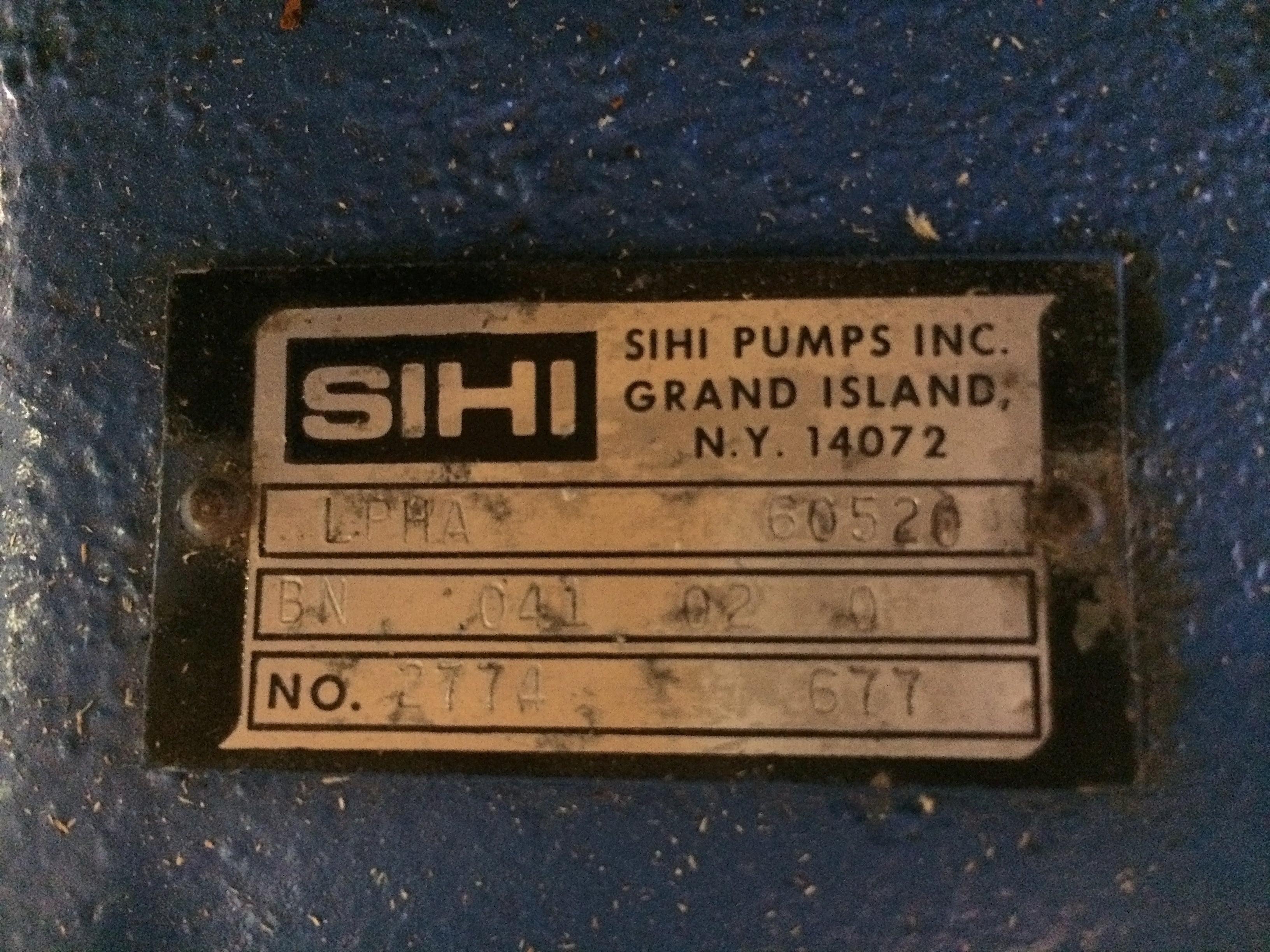 SIHI Pumps, Inc. Patín de bomba de vacío. Modelo: LPHA 60520. BN 041 02 0. No.: 2774 677. Capacidad a 1750 RPM; 251-371 CFM dependiendo del nivel de vacío (aire saturado). Requisito de flujo de líquido de servicio: 7 GPM. Patín construido por Rogers Machinery Co. Thermal Transfer Products Intercambiador de calor modelo: B-1003-B4-F, presión de funcionamiento 250 PSI carcasa/150 PSI tubos, 350F, serie 185688. Tanque vertical. Motor Lincoln Lincguard a prueba de goteo: 25 HP, 1750 RPM, 230/460 V, 64/32 amperios, 60 Hz, trifásico, estructura 284T. Dimensiones totales de la caja: 89 x 48 x 54 pulgadas, 2100 LBS.