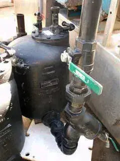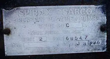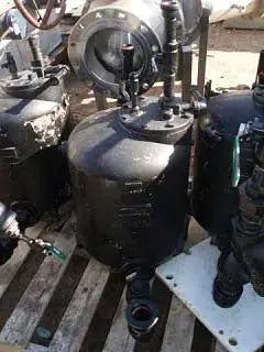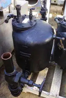 Bomba accionada por presión Spirax Sarco. Tipo: PPC. Tamaño: 2. No. BM: 68547. No. de inspección: 718F96. Presión máxima: 125 psi. Entradas: (1) 2 pulg. de diámetro. Puerto de alimentación de líquido, (1) 1/2 pulg. de diámetro. puerto de presión de funcionamiento. Salidas: (1) 2 pulg. de diámetro. Puerto de descarga de líquido, (1) 1 pulg. de diámetro. puerto de escape, (1) 3/4 pulg. de diámetro. puerto de drenaje, (1) 1/2 pulg. de diámetro. enchufar. Dimensiones totales: 3 pies 4 pulgadas de largo x 1 pie 9 pulgadas de ancho x 2 pies 5 pulgadas de alto (bomba 1)