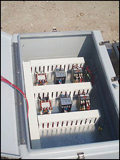 Caja eléctrica de plástico reforzado con fibra de Robroy Industries. Modelo: N302010HWT. Tipo: 4x. (2) Relés de choque Subaki. (2) Contactores Allen-Bradley. Dimensiones totales: 1 pie 9 pulgadas de largo x 1 pie 2 pulgadas de ancho x 2 pies 9 pulgadas de alto.
