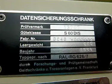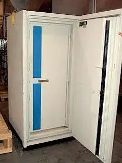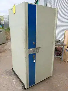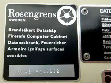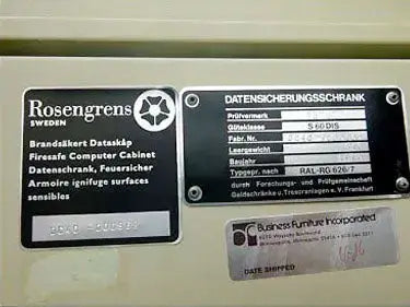 Caja fuerte ignífuga Rosengrens. Modelo: DC40. Número de serie: 000962. Dimensiones interiores: 1 pie 6 pulgadas de ancho x 1 pie 8 pulgadas de largo x 4 pies 11 pulgadas de alto. Dimensiones exteriores: 3 pies de ancho x 2 pies 9 pulgadas de largo x 6 pies .