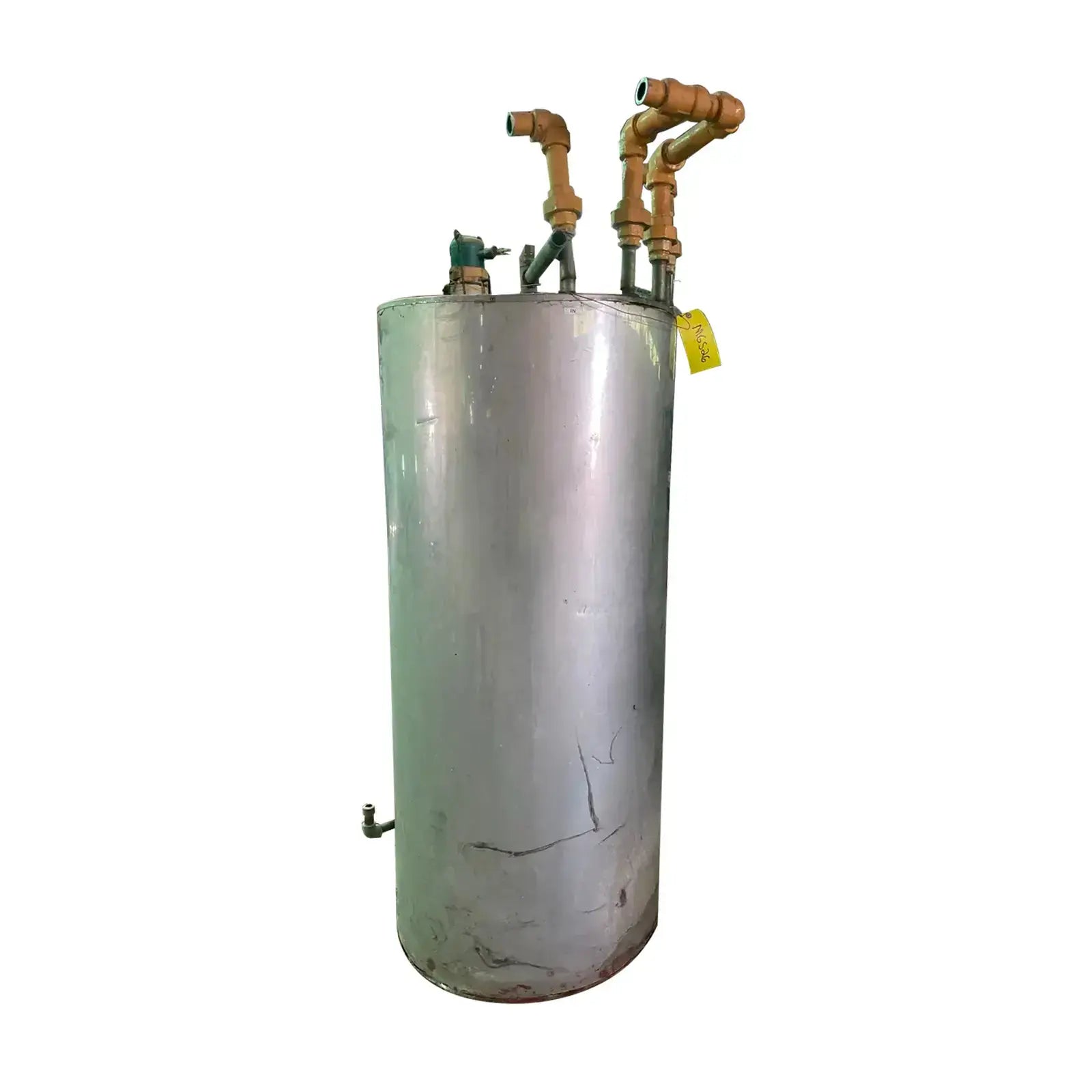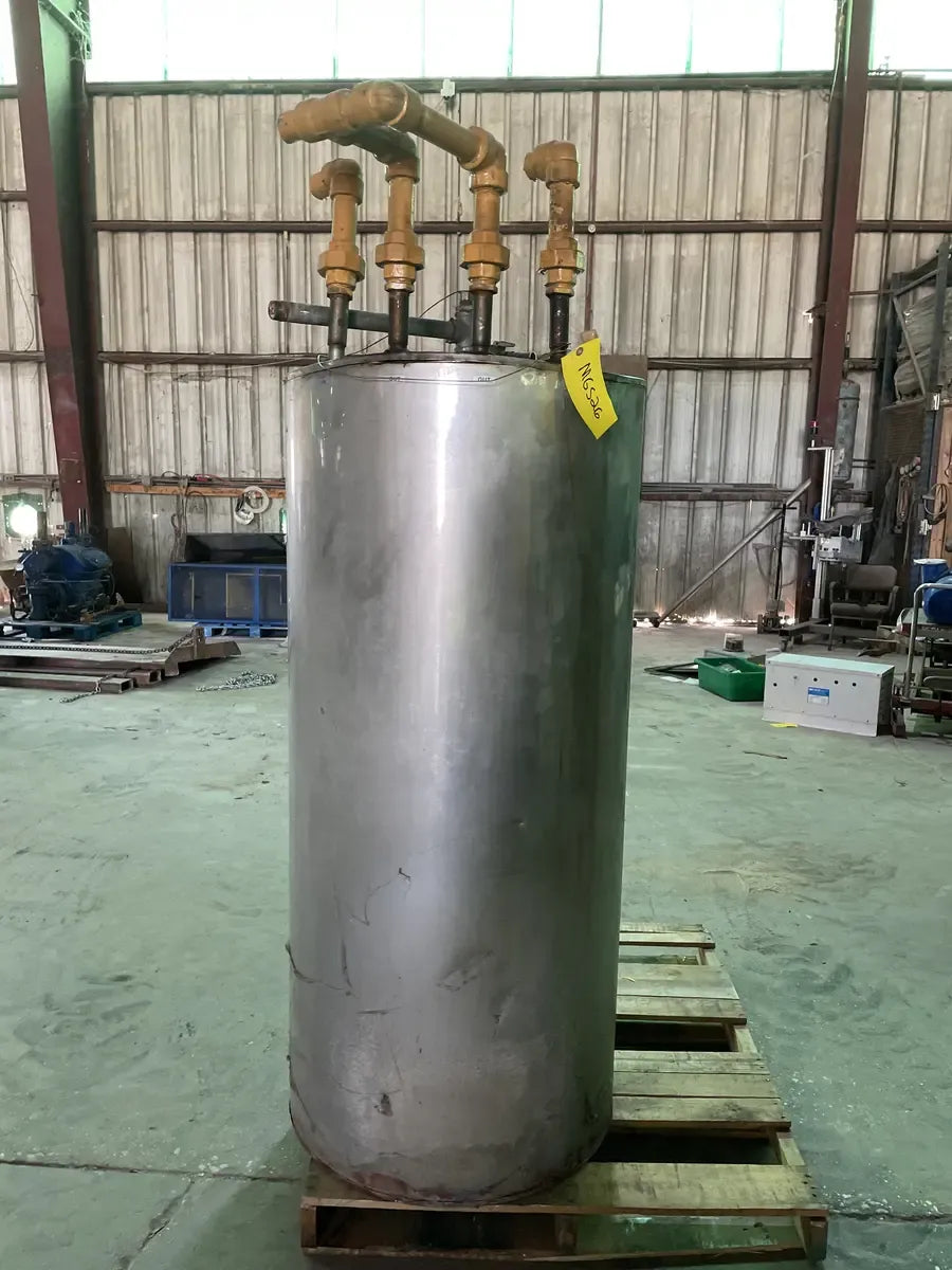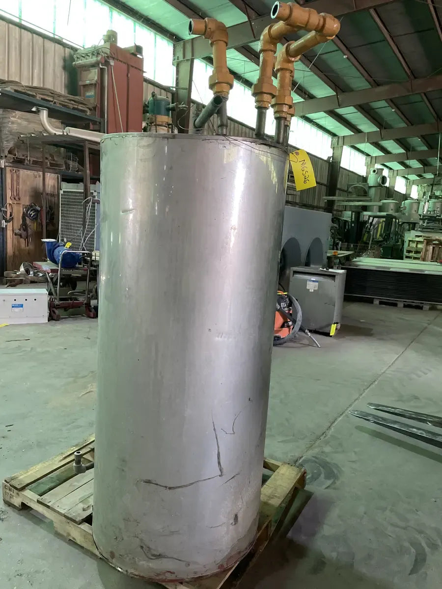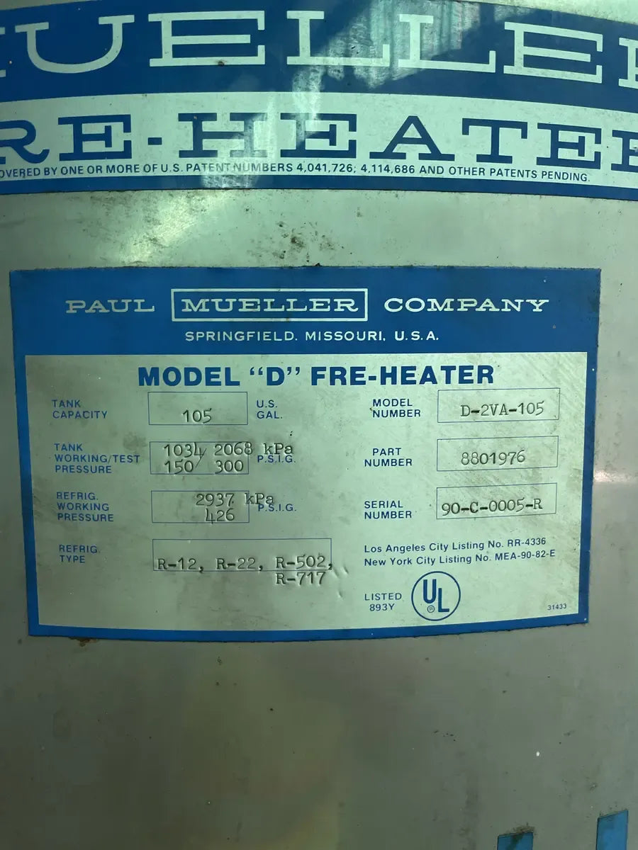 El sistema de recuperación Paul Mueller Fre-Heater recupera hasta el 60 por ciento de la energía desperdiciada que normalmente se desecha de los sistemas de refrigeración y acondicionamiento. A menudo se utiliza en supermercados, tiendas de comestibles y tiendas de conveniencia. Los Fre-Heaters son atemperadores que eliminan la mayor parte o la totalidad del calor sensible del gas caliente descargado por los compresores y utilizan el condensador existente para eliminar el calor restante y condensar el refrigerante. Número de modelo: D-2VA-105. Número de pieza: 8801975. Número de serie: 90-C-0005-R. Capacidad del tanque (Gal): 105. Presión de prueba de trabajo del tanque (PSIG): 150/300. Presión de trabajo de refrigeración (psig): 426. Tipo de refrigeración: R-12, R-22, R-502, R-717.