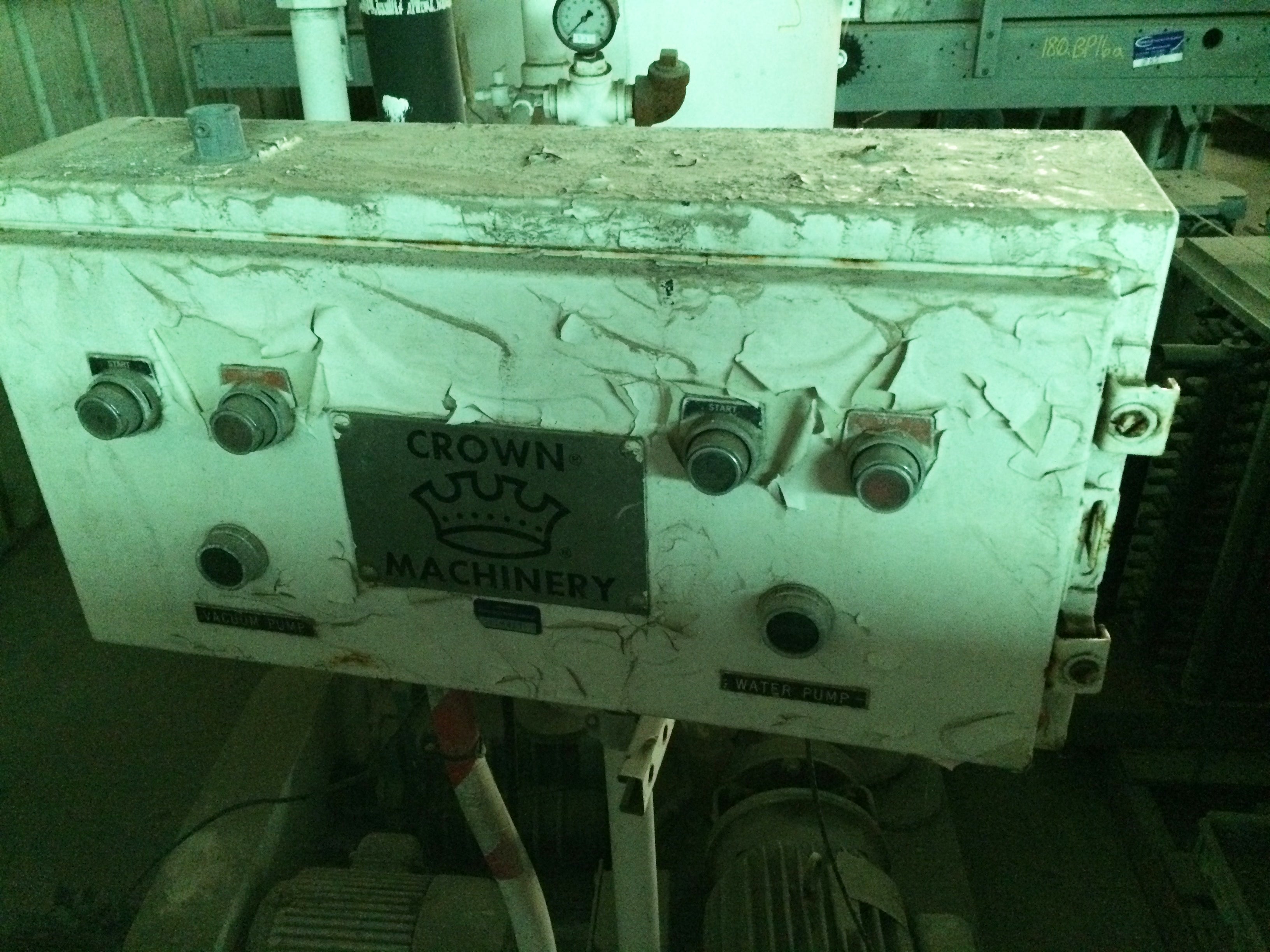 Dearador Canline de Crown Machinery. Modelo: CD.24.B.GK. S/N: CD.24.1017. Anteriormente propiedad y operado por Pepsi Bottling Group. Requisitos del sistema: 220 V, 60 Hz, trifásico. Bomba centrífuga MP Pumps, Modelo: 28347. S/N: 0200161. Motor industrial Baldor, 5 hp, 3450 rpm, 230/460 V, 12/6 amperios, 60 Hz, trifásico. Bomba de vacío GS Kinney, modelo: DK-30, S/N: 91-0320 D6547-5. Motor Brook, 1,5 hp, 200/400 V, 1425 rpm, 6 amperios, 50 Hz, trifásico. Entradas/salidas: (2) 2 pulg. de diámetro. TNP (hembra). Dimensiones totales: 73 pulgadas de largo x 41 pulgadas de ancho x 10 pies 5 pulgadas de alto.