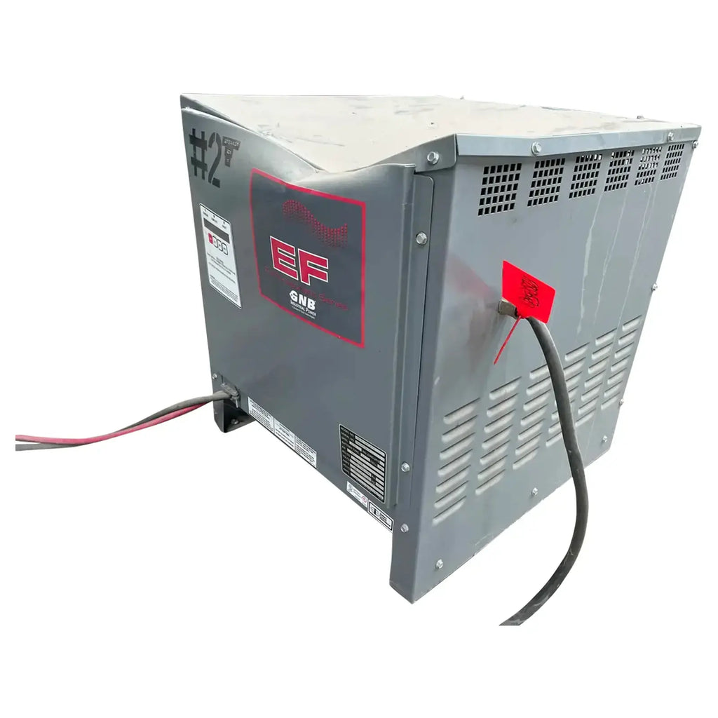 Cargador de batería para montacargas industrial GNB. Modelo: XPS18-750B EX-F. Número de serie: BM854900012. Especificaciones: 2915. Número de circuitos: 1. Tipo de batería: LA. Celda: 18. AH: 750. BCI.CD: 100D6C8. Entrada de CA: 208/240/480. Ph: 1. Amperios: 32,7/28,4/14,2. Hz: 60. Salida CC por circuito: Voltios: 36. Amperios: 135.