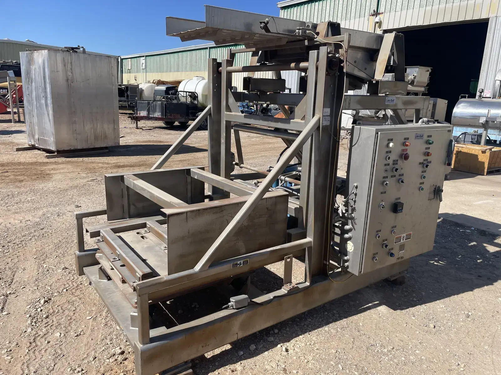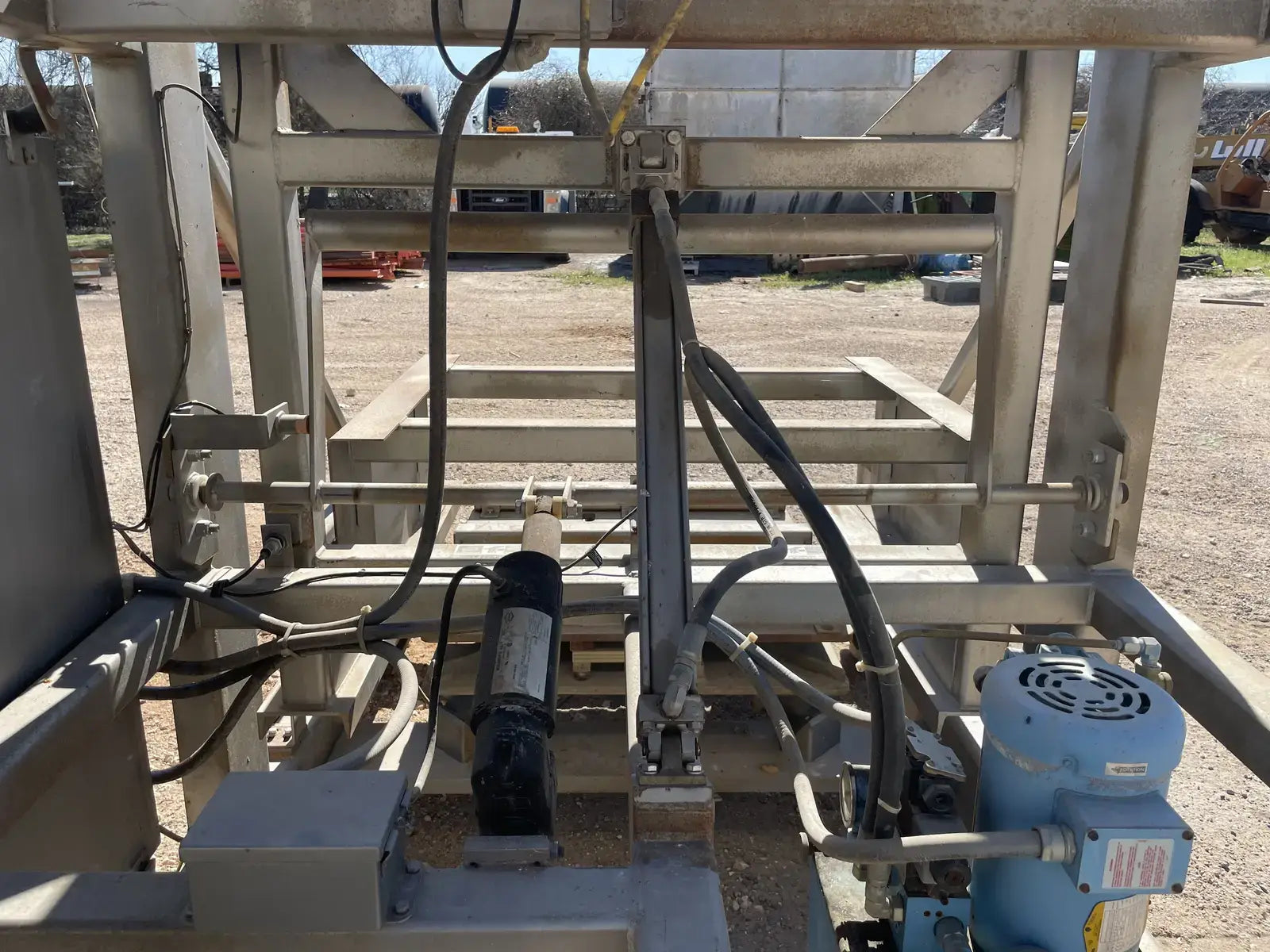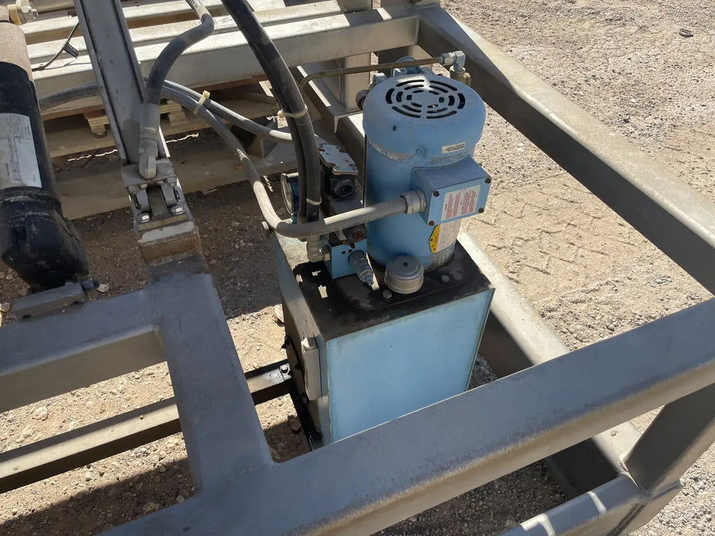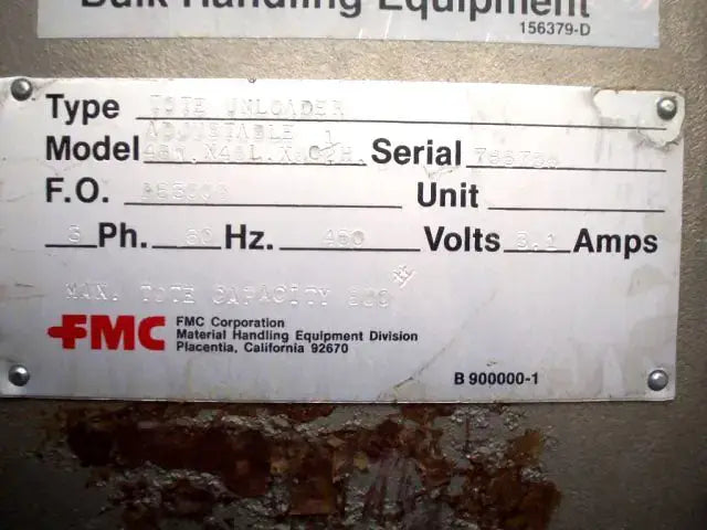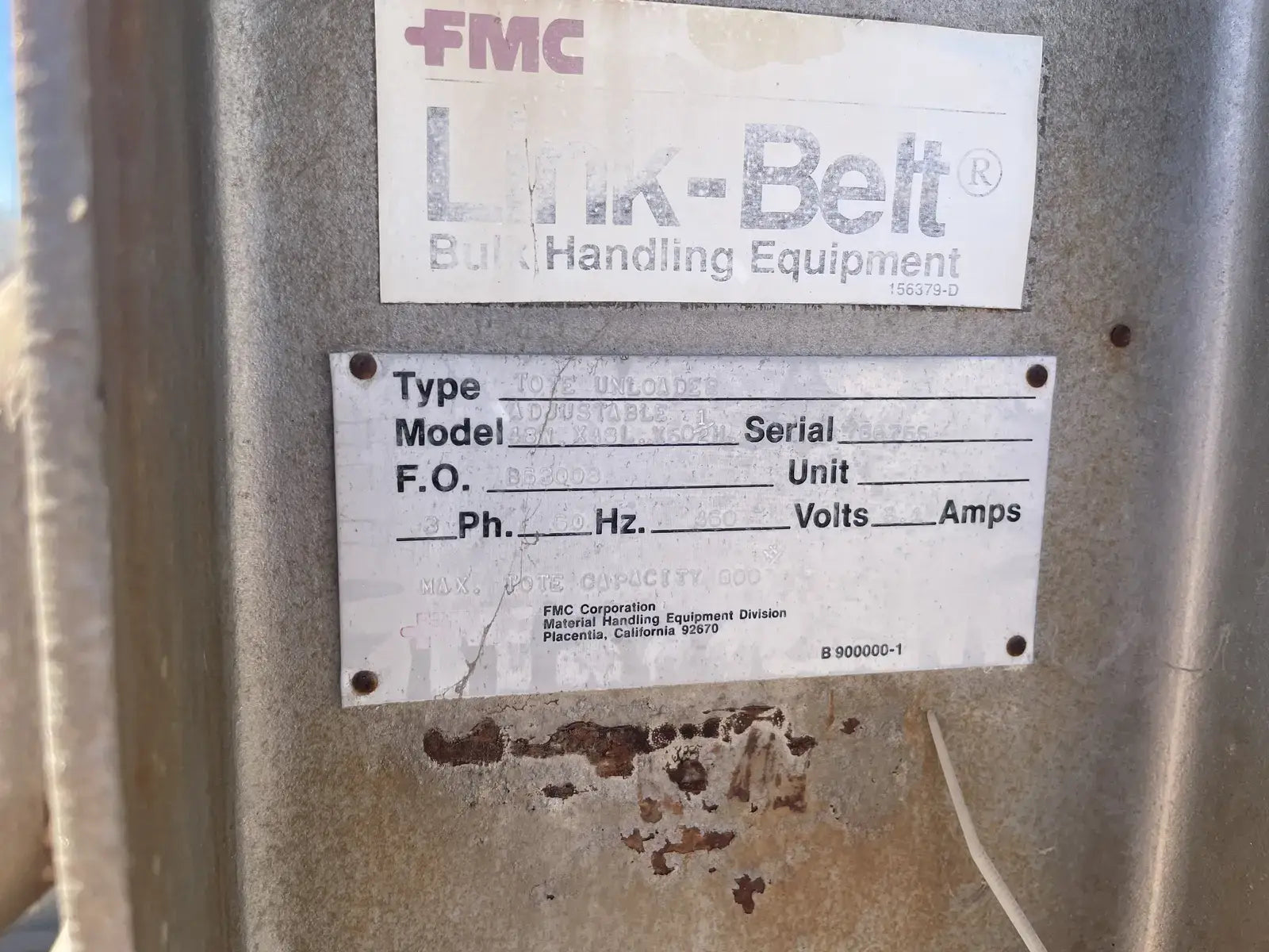 Cargador de bolsas FMC. S/N: 785755. FO No. B63008. Capacidad máxima del totalizador: 800 lbs. Fuente de alimentación: 460 V, 3,1 amperios, 60 Hz, trifásica. Actuador electromecánico eléctrico Warner. Fuente de alimentación: 115 V, 2,5 amperios, 60 Hz. Bomba hidráulica Vickens con motor industrial Baldor, 2 hp, 1725 rpm, 208-230/460 V, 6,5-6,2/3,1 amperios, 60 Hz, trifásica. Entradas/salidas: 82 pulgadas de largo x 24 pulgadas de ancho (cargador de bandeja de tolva). Dimensiones totales: 8 pies 5 pulgadas de largo x 6 pies 1 pulgadas de ancho x 7 pies 9 pulgadas de alto.