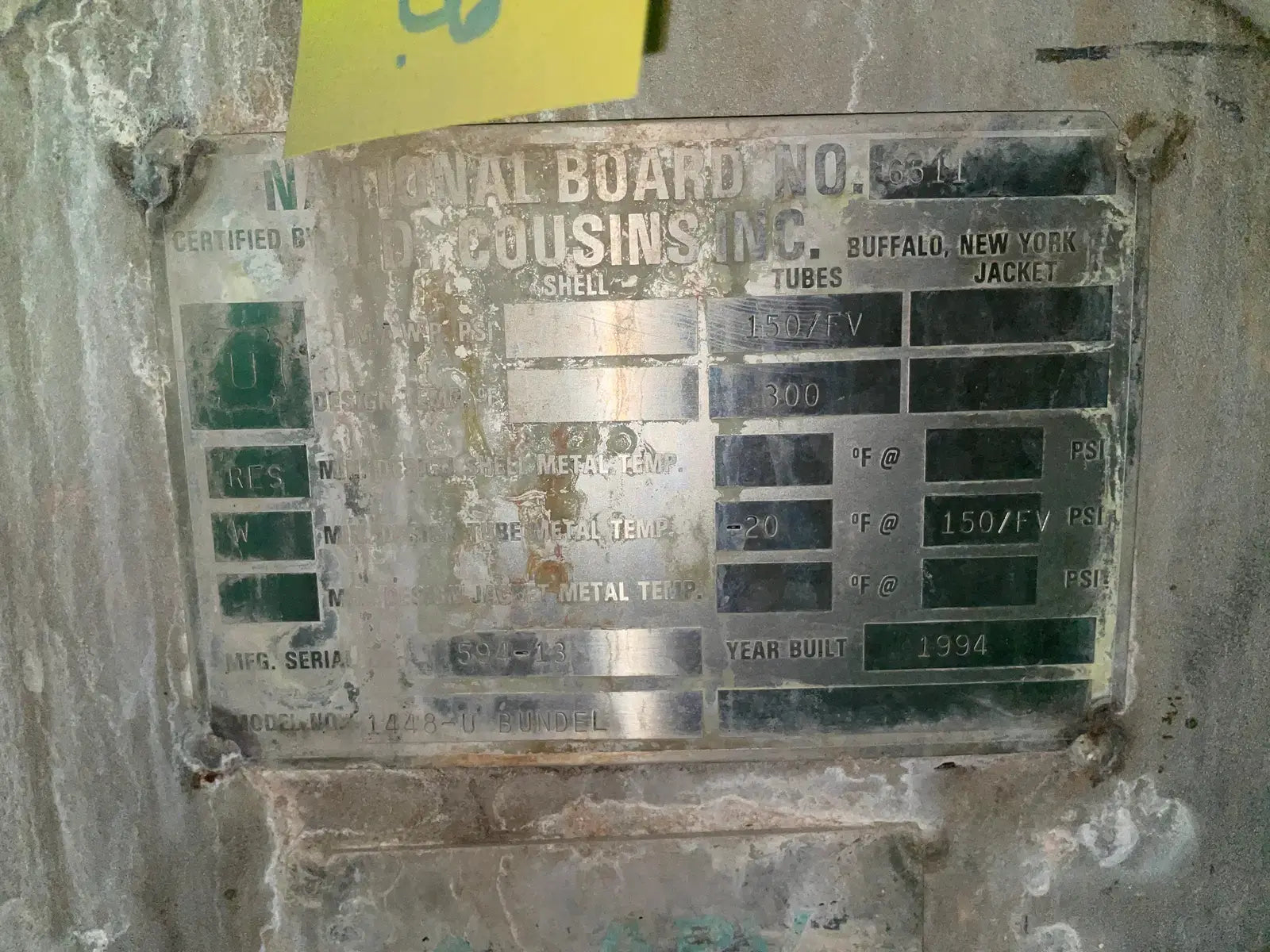 Cavitador APV Crepaco Bundel para recuperación de esencia. Modelo: 1448-U. Serie: 594-13. Orientación vertical. Incluye caja de control. Clasificaciones del tubo: MAWP: 150 PSI/FL a 300 F; MDMT: -20F a 150 PSI/FV. Año de construcción: 1994.