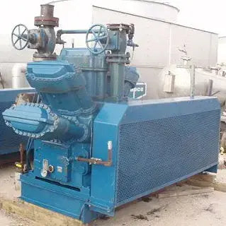 (2) Compresores alternativos Crepaco de 10 cilindros - 100 HP. Modelo: KL-24. Diámetro y carrera: Motor Allis-Chalmers de 6-3/4 pulg. x 5 pulg., 100 hp, 1770 rpm, 230/460 V, 238/116 amperios, 60 Hz, trifásico. Motor Lincoln, 100 hp, 1770 rpm, 230/460 V, 238/116 amperios, 60 Hz, trifásico. Polea impulsora: 10-1/2 pulg. de diámetro. Polea conducida: 1 pie 9 pulgadas de diámetro. Relación de polea: 0,5. Revoluciones finales: 885. Entrada: (1) 5 pulg. de diámetro. puerto embridado. Salida: (1) 4 pulg. de diámetro. puerto embridado. Dimensiones totales: 10 pies 1 pulgada de largo x 4 pies 5 pulgadas de ancho x 6 pies 1/2 pulgada de alto.