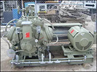 Compresor alternativo de amoníaco Mycom de 8 cilindros. Modelo: N8B. Refrigerante: R-717 (Amoníaco). Desplazamiento: 450 cfm. FUGA (Psig) HP: 313. LP: 185 HYD (Psig) HP: 470. LP: 470. Motor eléctrico Lincoln: 150 hp, 460 V, 60 Hz, 1780 rpm, trifásico, 169 A. Dimensiones totales: 8 pies LX 4 pies 7 pulgadas WX 4 pies 3 pulgadas H. (ACN311).