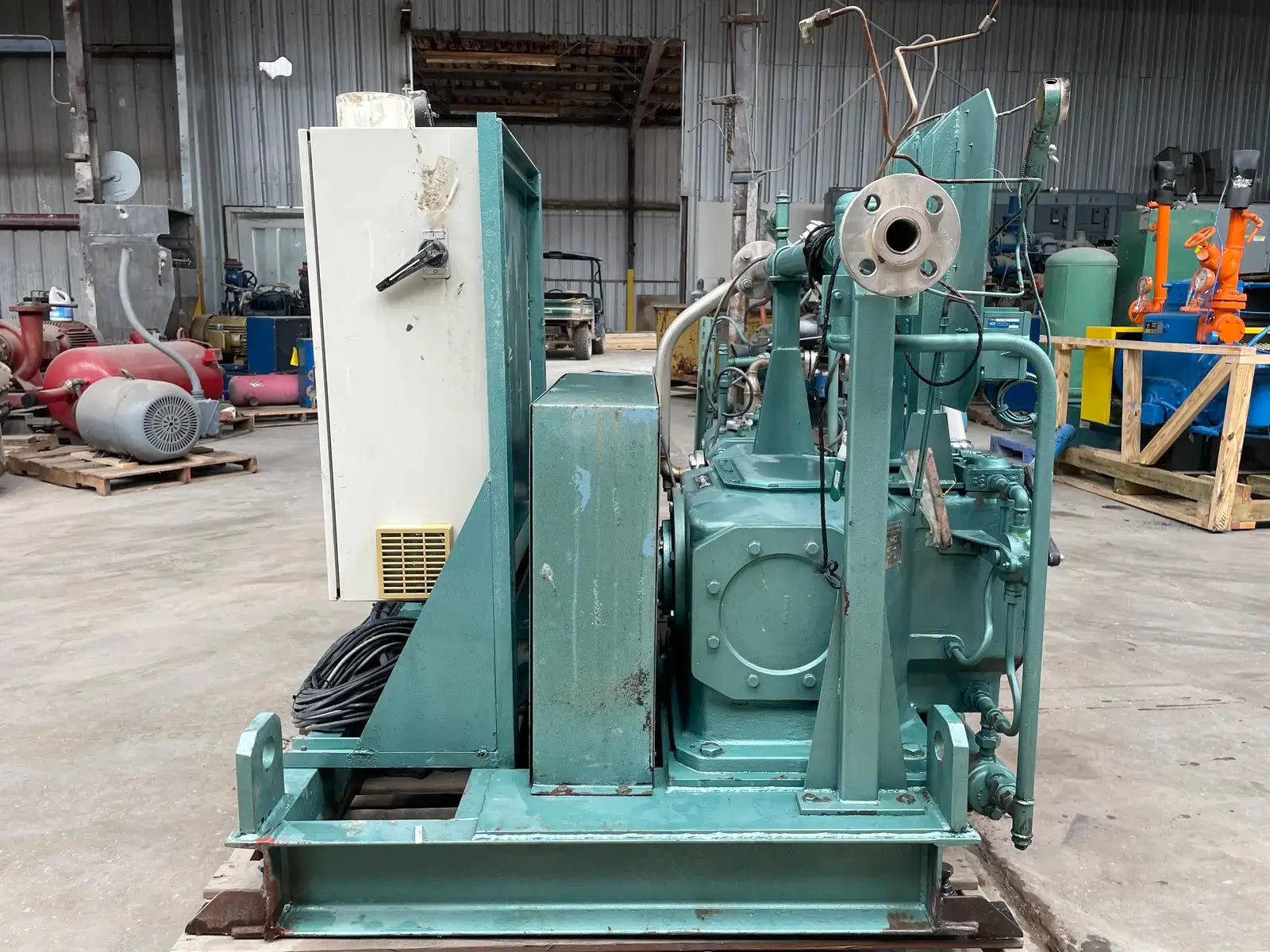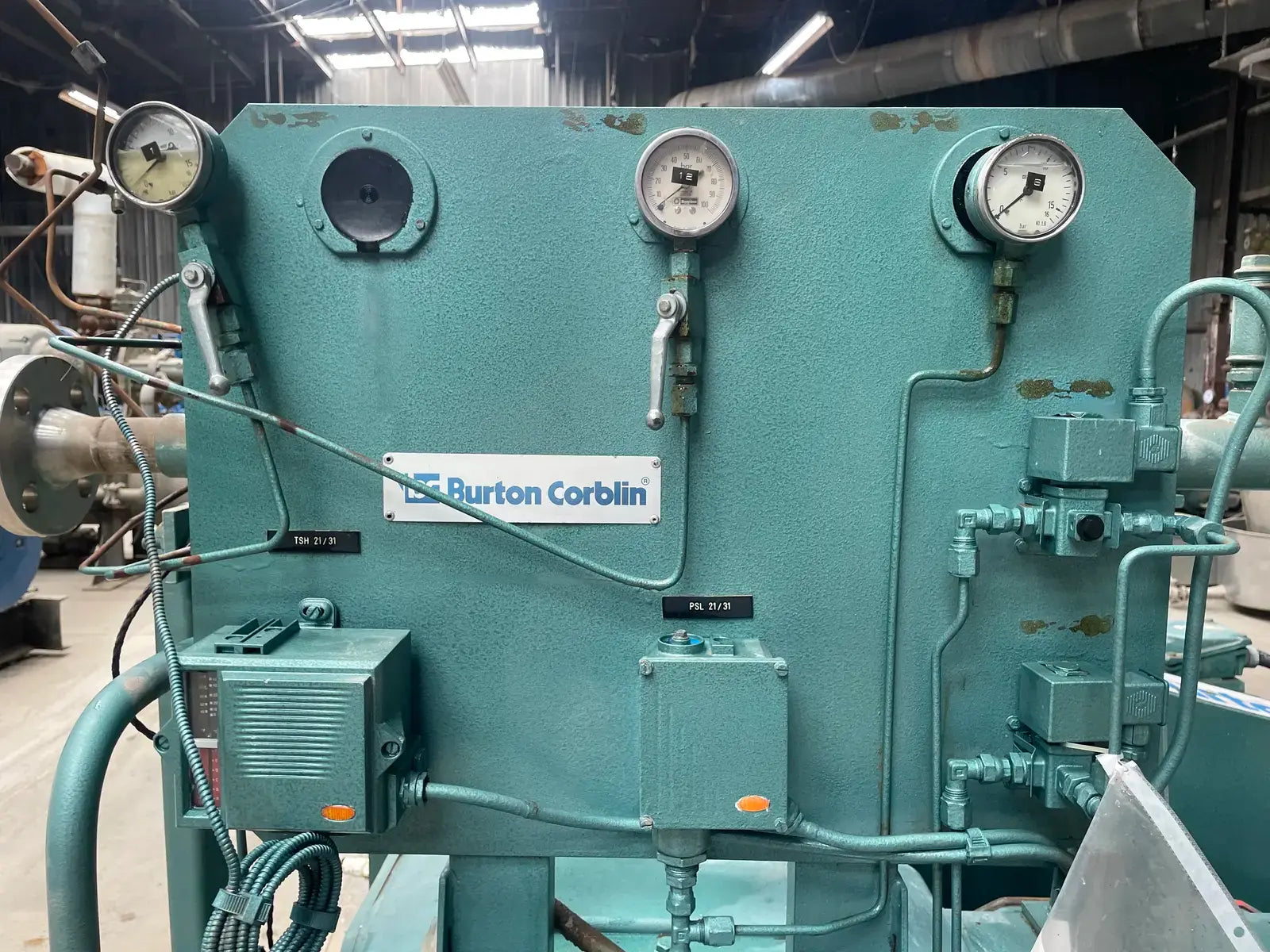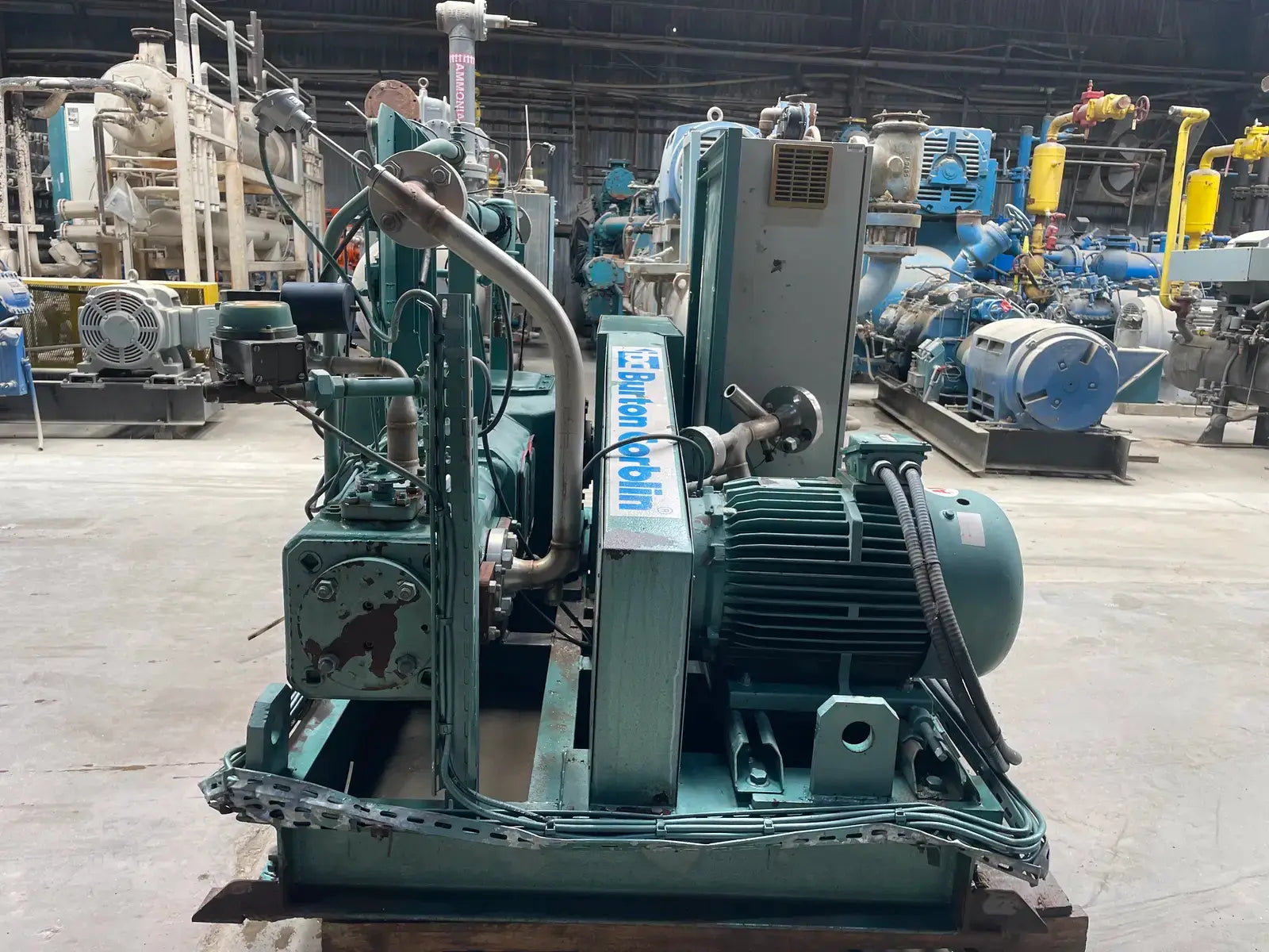 1990 Compresor de gas alternativo Burton Corbin. Modelo: P123 M82S. Motor eléctrico ABB de 30 CV. Las aplicaciones incluyen gases inertes como nitrógeno o hidrógeno. Entradas: (1) 1 pulg. de diámetro. Conexiones NPT, (1) 2 pulg. de diámetro. puerto embridado. Salidas: (1) 2 pulg. de diámetro. puerto embridado. Dimensiones totales: 7 pies 7 pulgadas de largo x 4 pies 11 pulgadas de ancho x 4 pies 7 pulgadas de alto (H11) (ACN1000)
